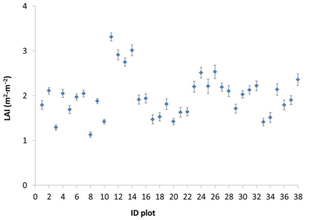 Consequently, the measurements made in the field were compared with the data elaborated from high-resolution satellite images (RapidEye). The data are an average of the pixels belonging to the same polygon of land cover. The scatterplot between field LAI measured and satellite LAI estimates are shown in Figure 6. The RMSE and R2 between measured and predicted LAI are 0.33 and 0.71, respectively.
