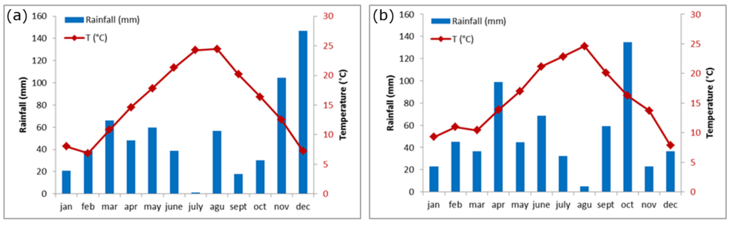 Seasonal trends of temperature and rainfall at an agrometeorological station in Andria for the years 2013 (a) and 2014 (b).