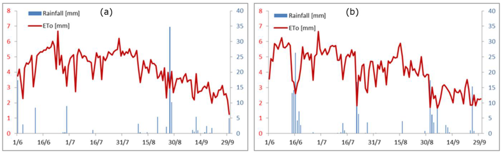 Seasonal trends of ET0 and rainfall events during the growing season for the years 2013 (a) and 2014 (b).