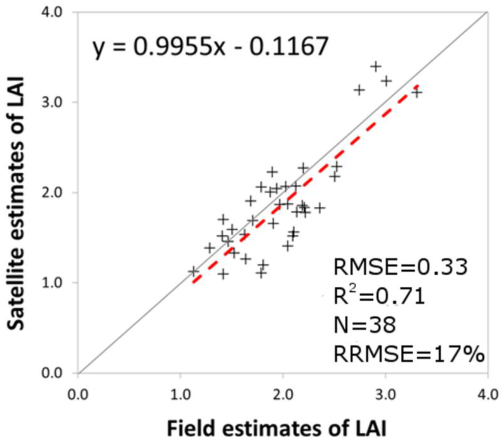 Scatter plots (n = 38) of field LAI estimates (23 to 24 July 2014) and satellite estimates of LAI (RapidEye image, 2 August 2014). RMSE: root mean square error. R2 = coefficient of determination. RRMSE: relative root mean square error. The broken red line shows the ordinary least squares linear regression fits. In black is the 1-to-1 line.