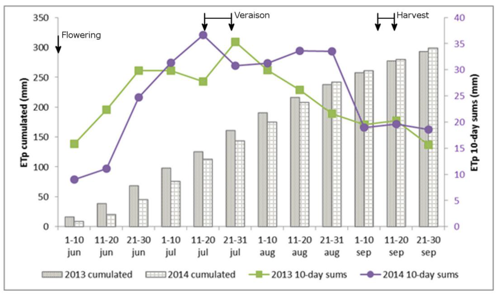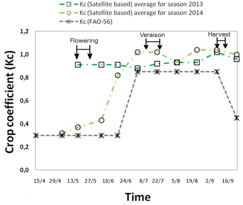 On the contrary, in the 2014 growing season the trend of estimated Kc value is similar to the Kc FAO trend, with a lower value at the beginning of the season, probably due to low temperatures up to flowering (Table 2), a peak from the first 10 days of July, a slight decrease in the first 10 days of August, and a plateau in the middle of the season. This observation may support the hypothesis that the vegetation growth and Kc trend, after a slow development, was stimulated by GDD accumulation that at veraison surmount the values of the 2013 growing season.