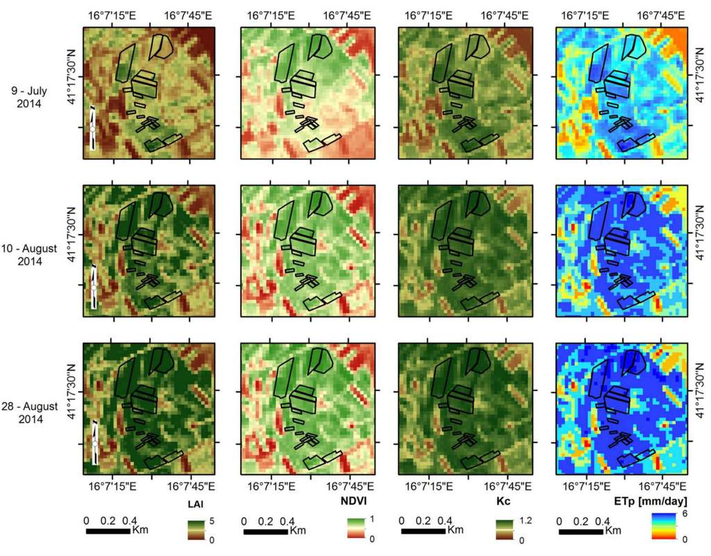 A variety of approaches, both empirical and physically-based methodologies, are used for ETp and Kc estimations. The first type of methods commonly uses the empirical relationships between Vegetation Indices (VI) and field observations to estimate the energy partitioning and canopy parameters like Kc, while the second type of methods relies on the application of radiative transfer models and strong theoretical and physical relationships that reflect the plant water status, crop characteristics, and soil water management [4,29]. A comprehensive review of remotely-sensed Vegetation Indices used to estimate canopy parameters and their advantages and disadvantages was proposed by Glenn et al. and Allen et al. [30,31]. Although physically-based methods outperform those based on a VI approach, the latter methods are simple to deploy and maintain both in time and space [28]. VI widely used to estimate Kc are the Normalized Difference Vegetation Index (NDVI), the Soil Adjusted Vegetation Index (SAVI), and the Weighted Difference Vegetation Index (WDVI). A considerable amount of research has been conducted in recent years to estimate Kc and the temporal evolution for annual and orchard crops under different climate conditions [2,4,26,27,32,33,34,35].