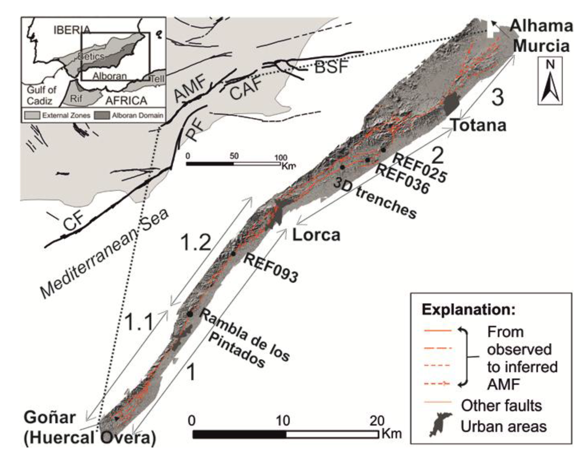 The AMF has been segmented based on fault trace geometry, orientation (it varies N45–65E), trace complexity, seismicity, and geological history (Figure 1; [29]). From south to north, the segments are: (1) Huercal Overa-Lorca, ending in the south in a horse-tail (formed by two subsegments whose subdivision is in Rambla de los Pintados); (2) Lorca-Totana, where the fault splits into several sub-parallel fault traces; (3) Totana-Alhama de Murcia; and (4) Alhama de Murcia-Alcantarilla, where the geomorphic manifestation of the fault is diffuse. The southern ending of the fault is in a tiny district belonging to Huercal Overa, named Goñar, but we will refer to it as Huercal Overa (Figure 1).