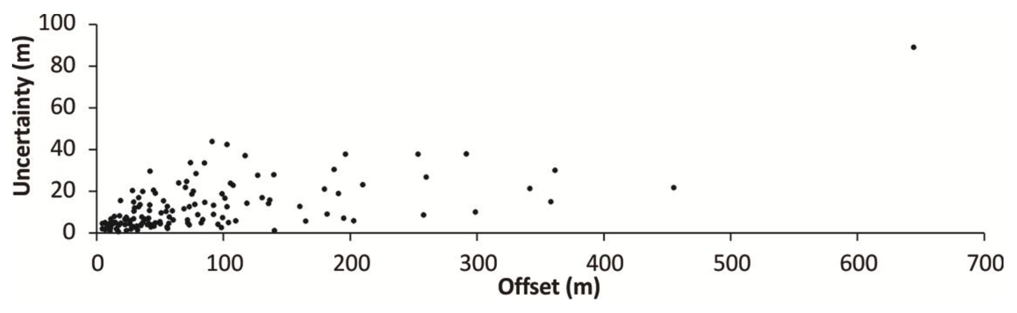 The relationship between the amount of displacement and the horizontal uncertainty in our AMF dataset do not follow the same proportionality for all features (Figure 3; that is, big offsets do not necessarily have big uncertainties and small offsets, small uncertainties) [17]. Extrapolate a logarithmic relation for uncertainty and offset.