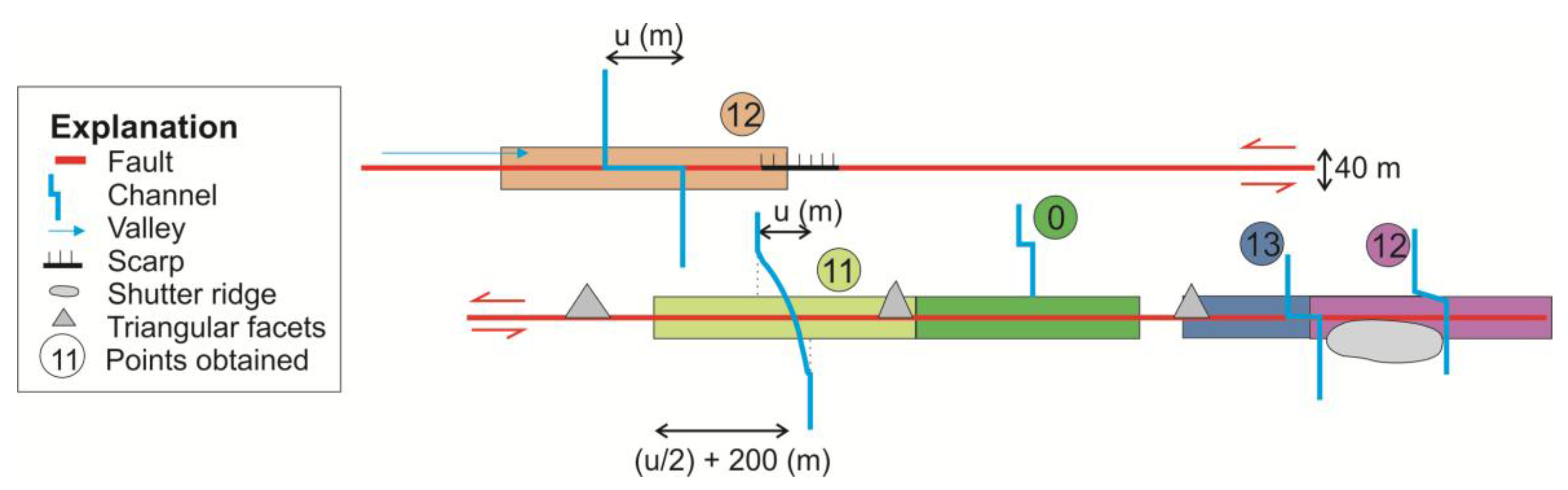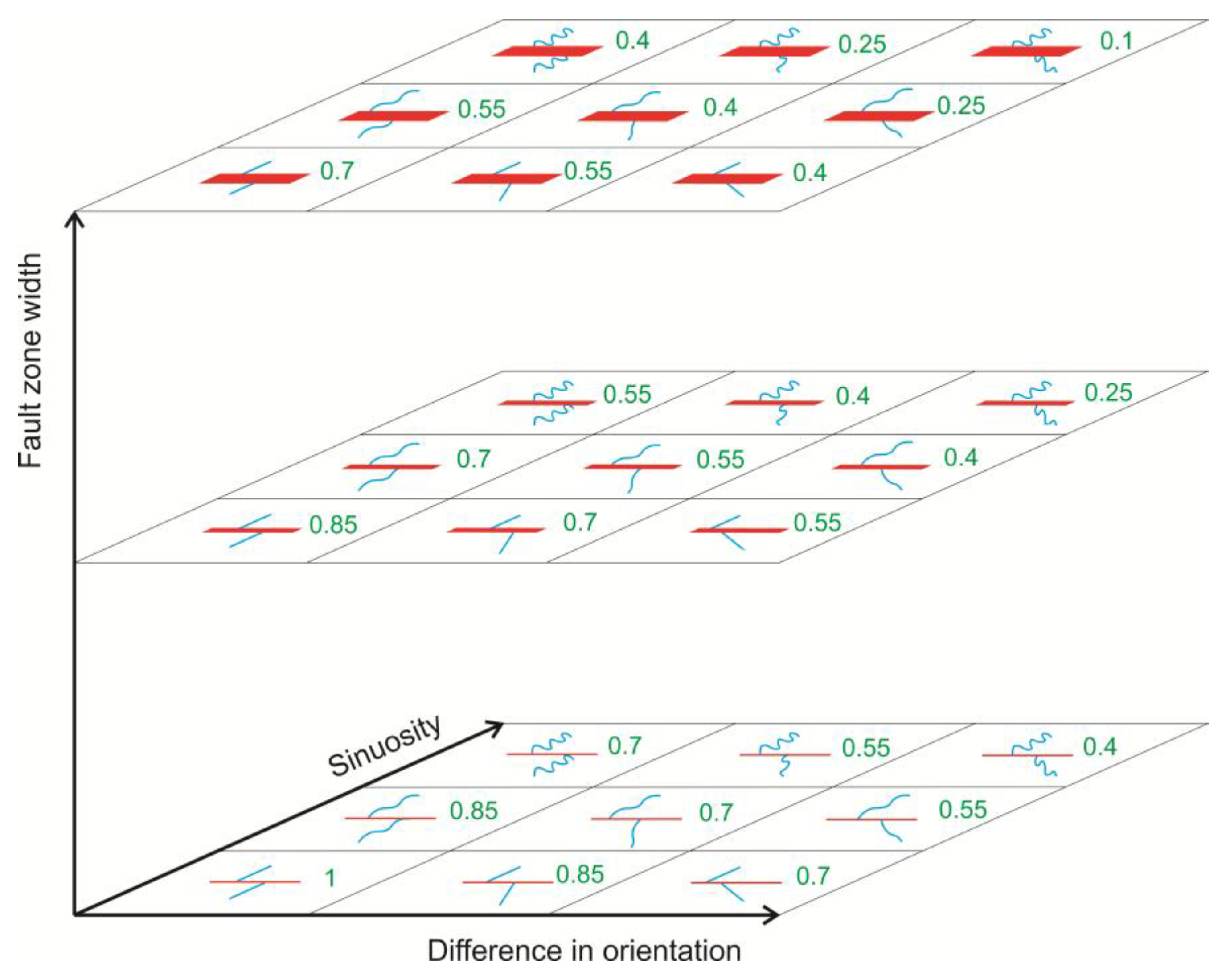 The shape parameter can be decomposed into three sub-parameters: (1) fault zone width; (2) angular difference in orientation between the two parts of the considered feature (on either side of the fault); and (3) sinuosity of the channels. Figure 5 illustrates the rating according to the three sub-parameters (modified significantly from [17]). Every time one sub-parameter decreases one step along its axis, the value of the final shape scoring decreases 0.15 (Figure 5). The three sub-parameters can be considered separately, as well. In this case, every step of increase sub-parameter represents 0.45 points of decrease in the value of its scoring. For example, sinuosity would take ratings 1, 0.55 and 0.1 as it increases. The shape scoring would be the same when considering them (fault zone width, sinuosity and difference in orientation) separately, as values and decrements are proportional.
