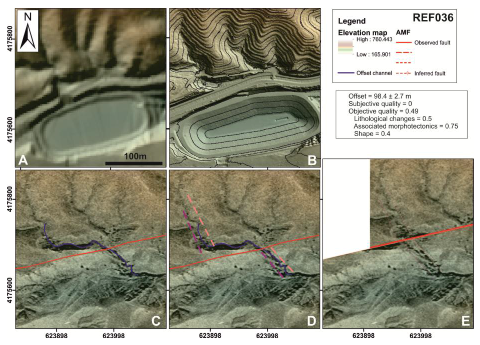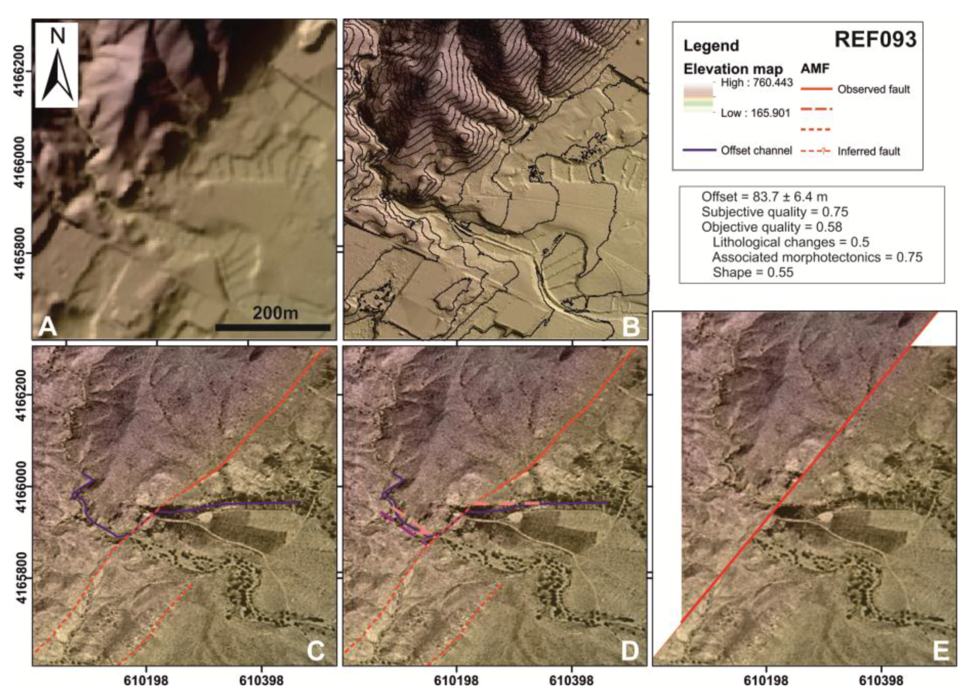 Interpretation of offset REF036—In this example, objective quality is larger than subjective quality: (A) old Digital Elevation Model (DEM) with a resolution of 4 m; (B) new lidar derived hillshade and 5 m contour map; (C) 1956 ortophoto showing the location of the fault and the offset stream; (D) 1956 ortophoto showing some projected piercing lines (pink dashed lines represent the left bank of the channel, and purple lines the right bank looking downstream); and (E) back slip model of the offset.