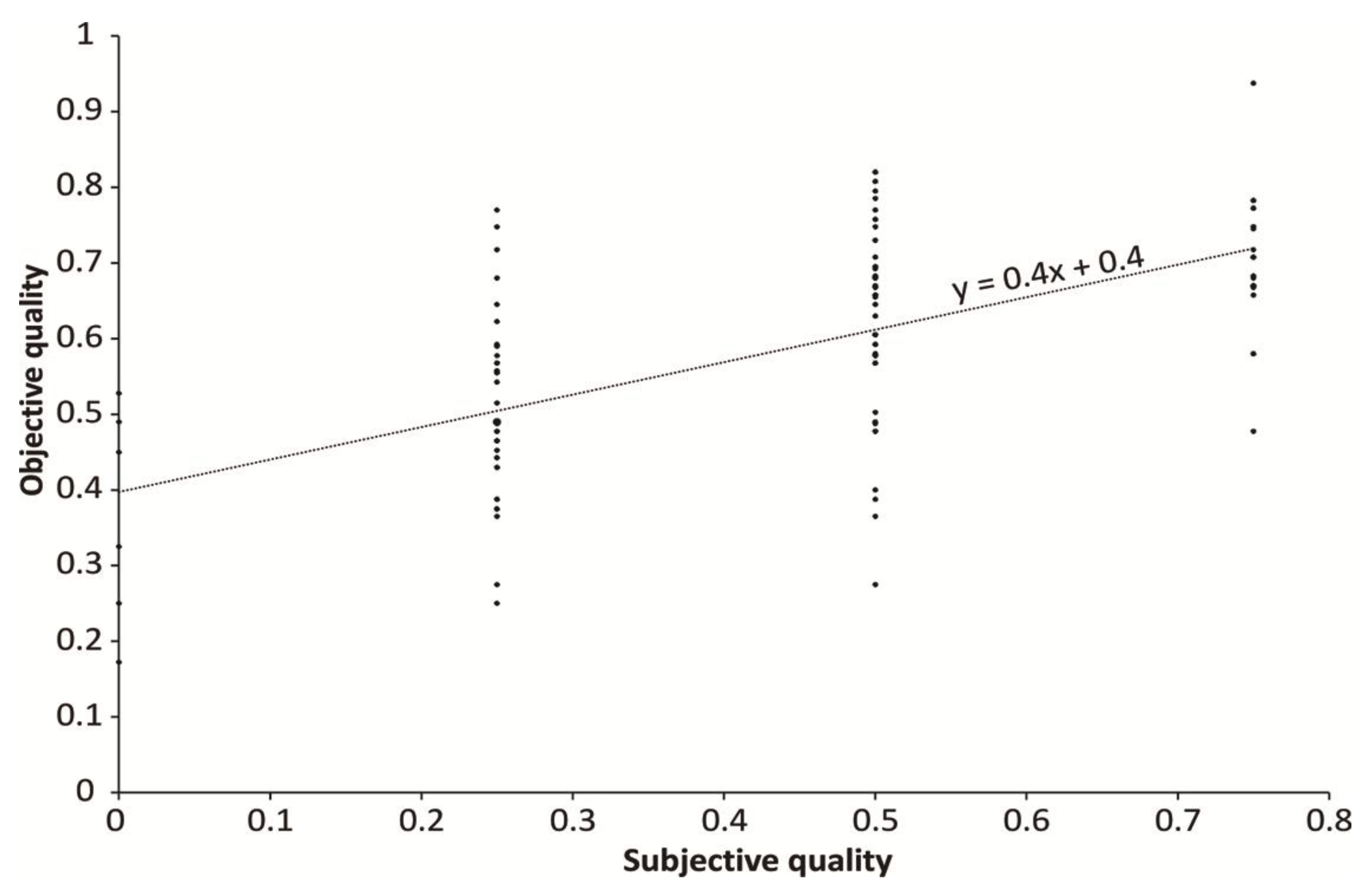 Plot of subjective versus objective quality. The equation of the correlation line was added as a reference.