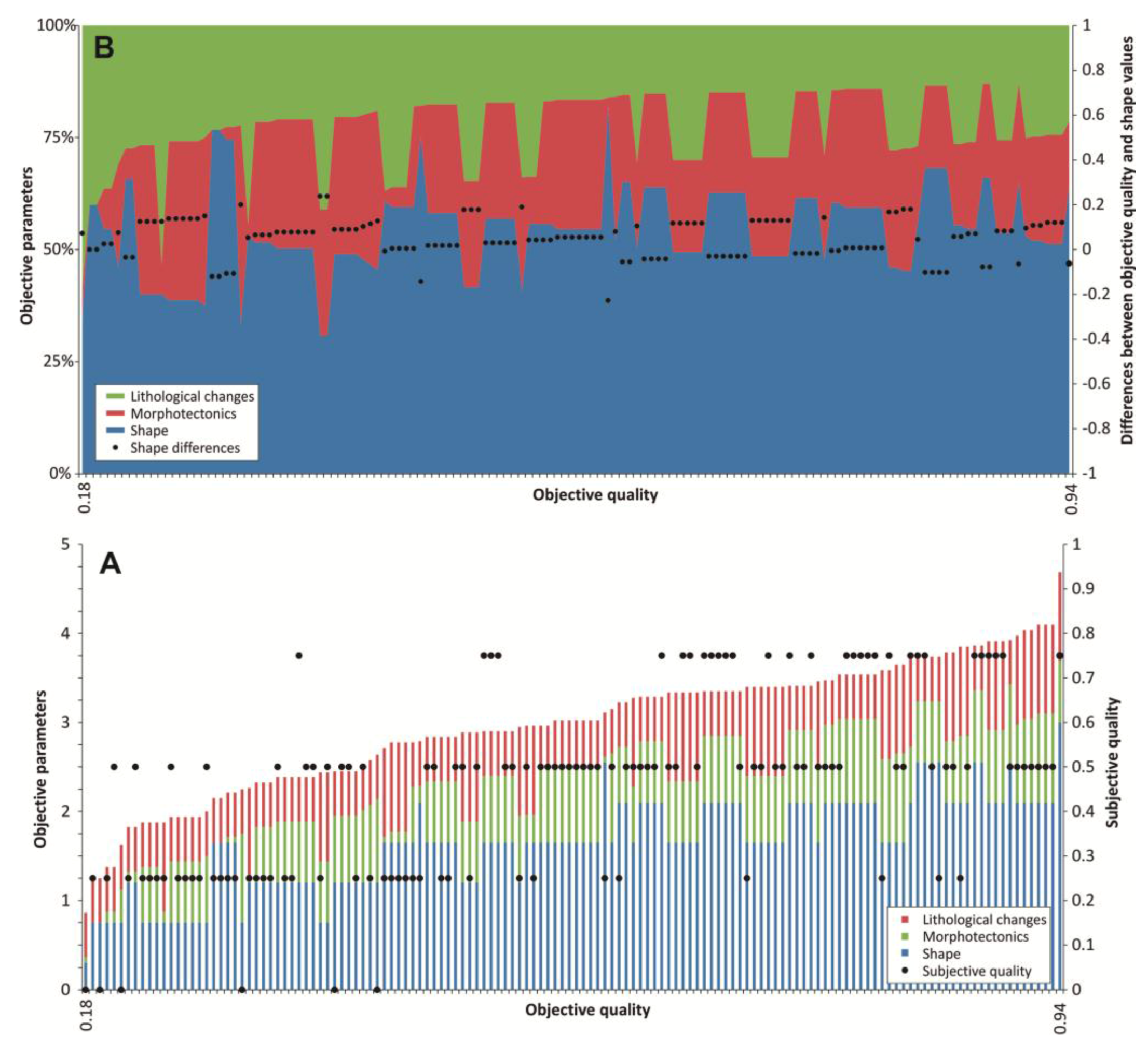 In general, objective quality correlates with shape (Figure 11A), thus shape increases when objective quality increases. Although shape contributes 3/5 (60%) to the objective scoring (Equation (1)), the contribution of the shape in the relative contribution plot (Figure 11B) is constant (about 50% of the total objective scoring). This constant contribution is a significant difference compared to the other objective parameters (lithological changes and associated morphotectonics). Additionally, the average differences between the shape scoring and the objective quality tend to zero (exceptional cases range between −0.25 and 0.25; Figure 11B).