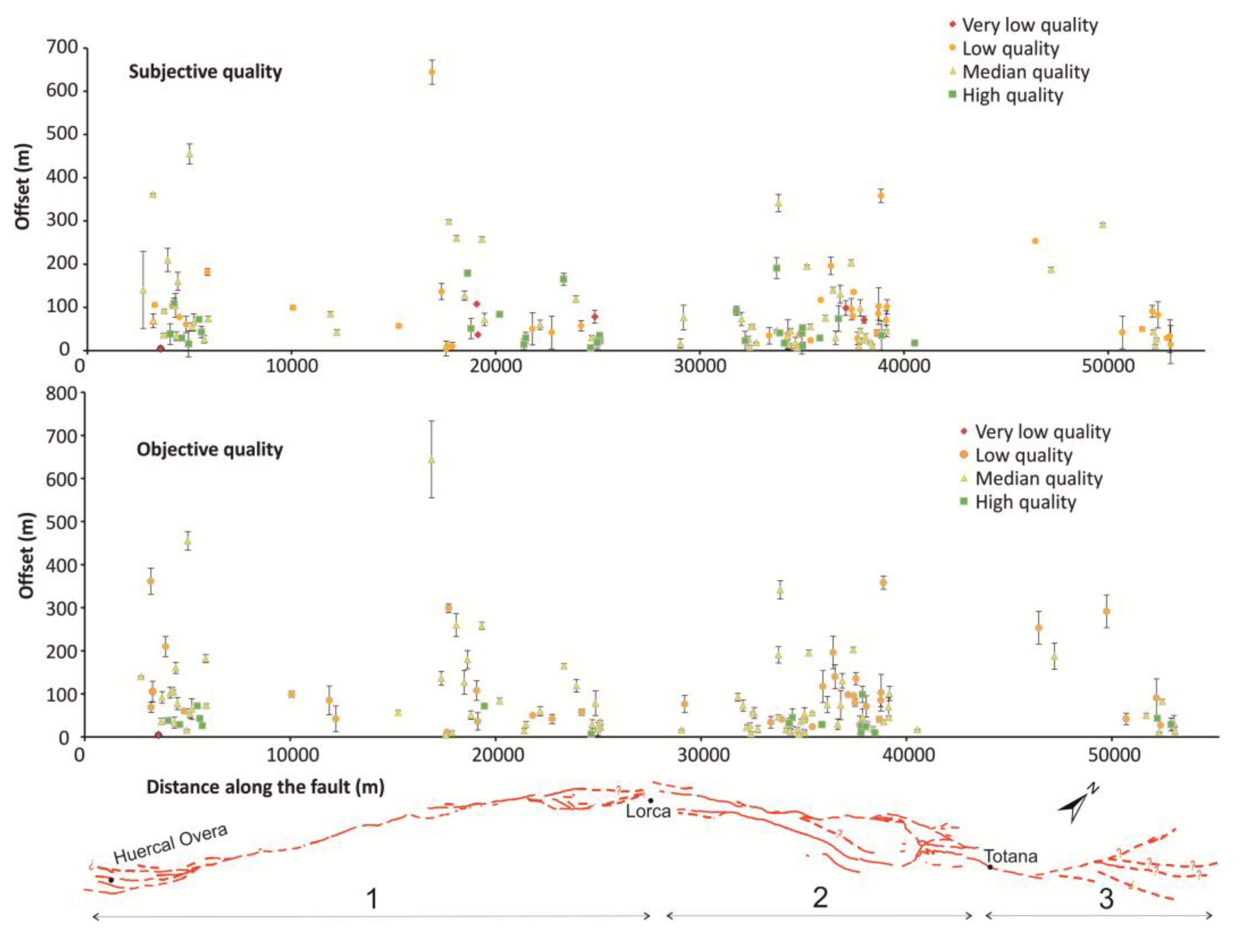 Offset geomorphic features along the Alhama de Murcia fault. Error bars represent uncertainties (mean standard deviation values, 1σ). Scoring for both subjective (upper plot) and objective (lower plot) quality are represented with different symbols. Objective or subjective quality legend: [0–0.25), very low quality; [0.25–0.5), low quality; [0.5–0.75), median quality; [0.75–1], high quality. No clusters on the amount of offset are evident in these plots. The AMF trace and its segmentation (see Figure 1 for numbers explanation) are shown at the bottom of the figure.