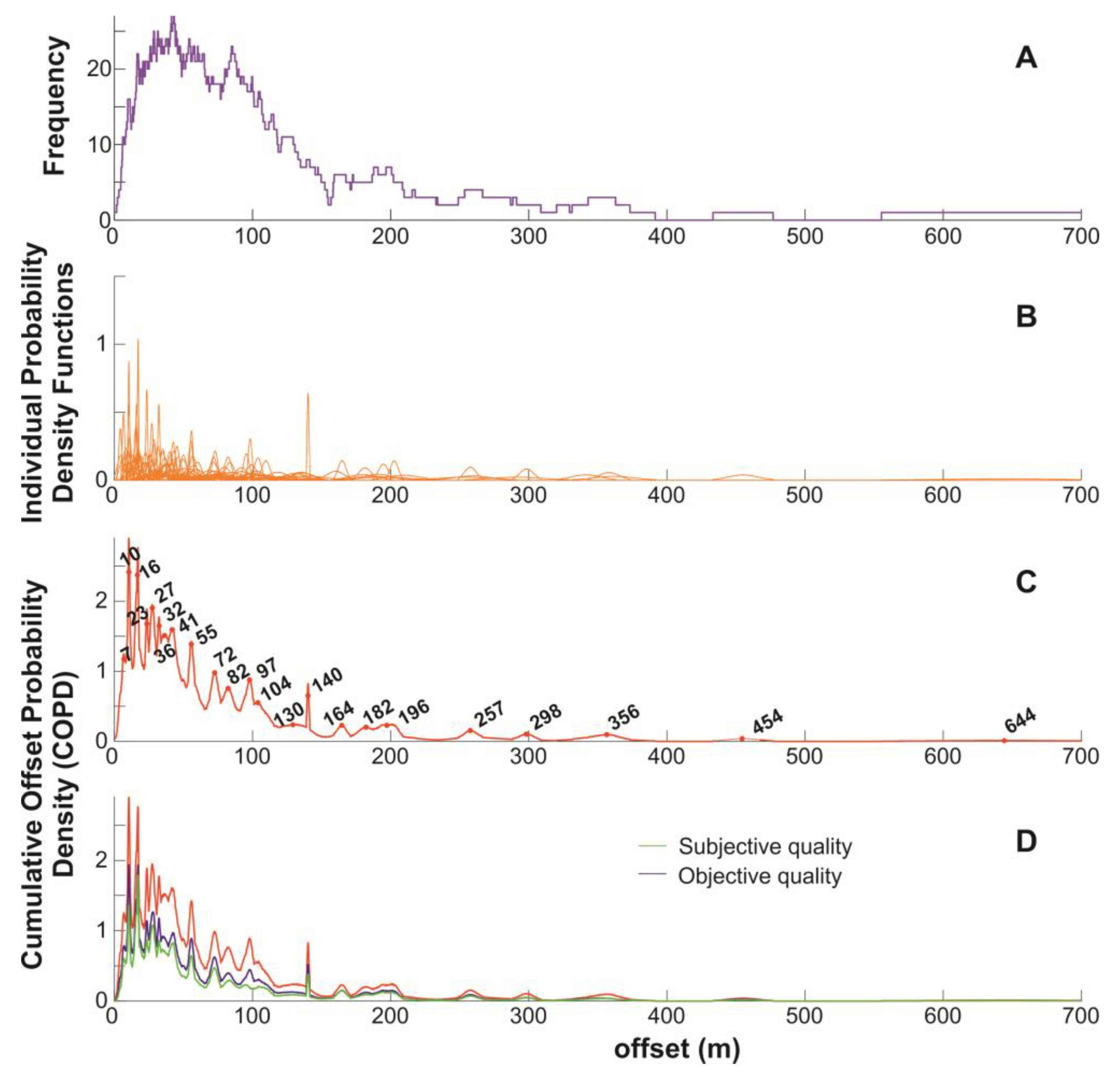 (A) Histogram of the offsets and uncertainties. (B) Individual Probability Density Functions (PDF) of all features along the fault. (C) Cumulative Offset Distribution Probability (COPD) with no weighting and peak values highlighted. (D) COPD weighted previously with subjective (green) and objective (blue) quality score. Notice the difference in the vertical axis in the probability values (B–D). In general, the subjectively weighed COPD (green line) is lower than the objective COPD (blue line).