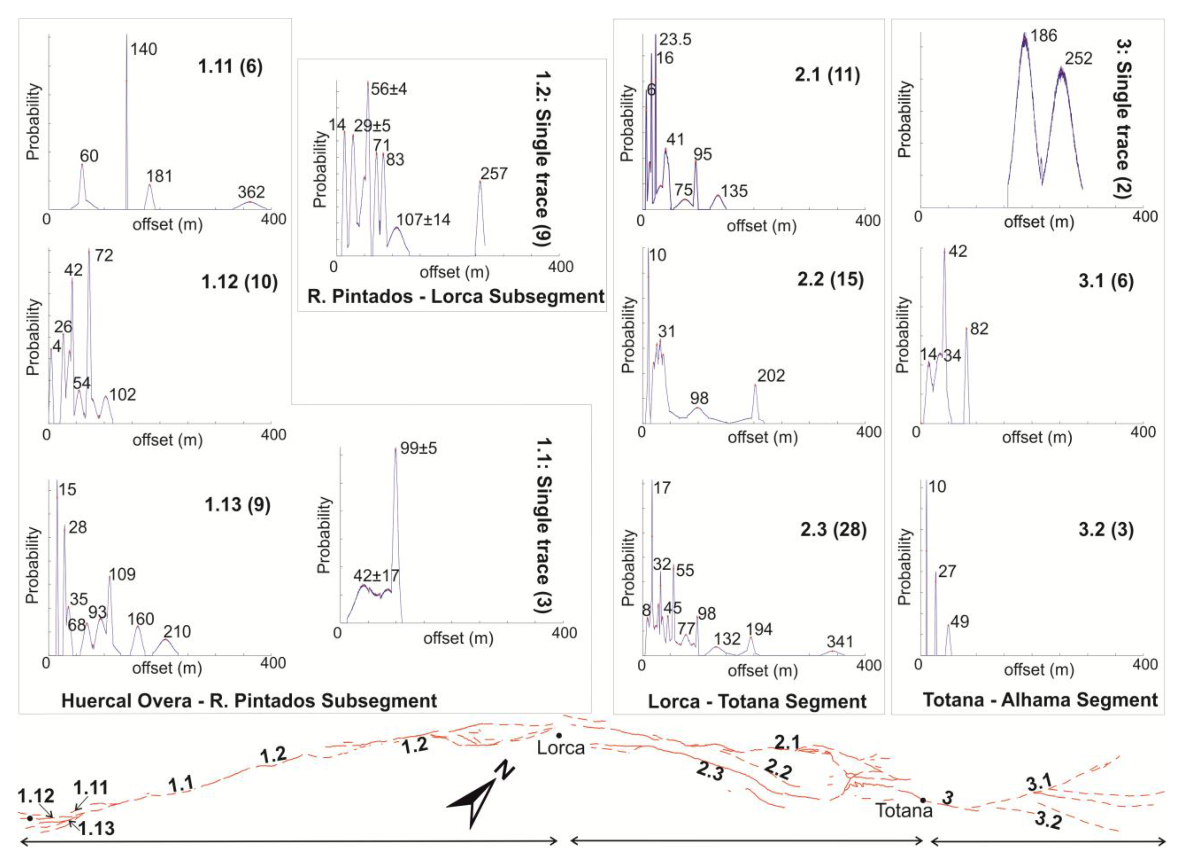 The COPD of all of the data (Figure 13C,D) does not take into account the characteristics of the individual fault segments (Figure 1). Even if we assume that all the fault segments have the same characteristics (e.g., slip-rate), where the fault is composed of several fault traces, the individual parameters will vary. Therefore, we do the same analysis considering individual segments and individual fault traces (Figure 14). COPDs are computed for Segments 1.1 (Huercal Overa-Rambla de los Pintados), 1.2 (Rambla de los Pintados-Lorca) and 3 (Totana-Alhama de Murcia) where the fault is a single trace; and for segments where the fault splays: (a) three fault traces in the horse-tail termination; (b) the sub-parallel traces in Segment 2 (Lorca-Totana); and (c) for two traces in the Totana-Alhama de Murcia segment (Segment 3).