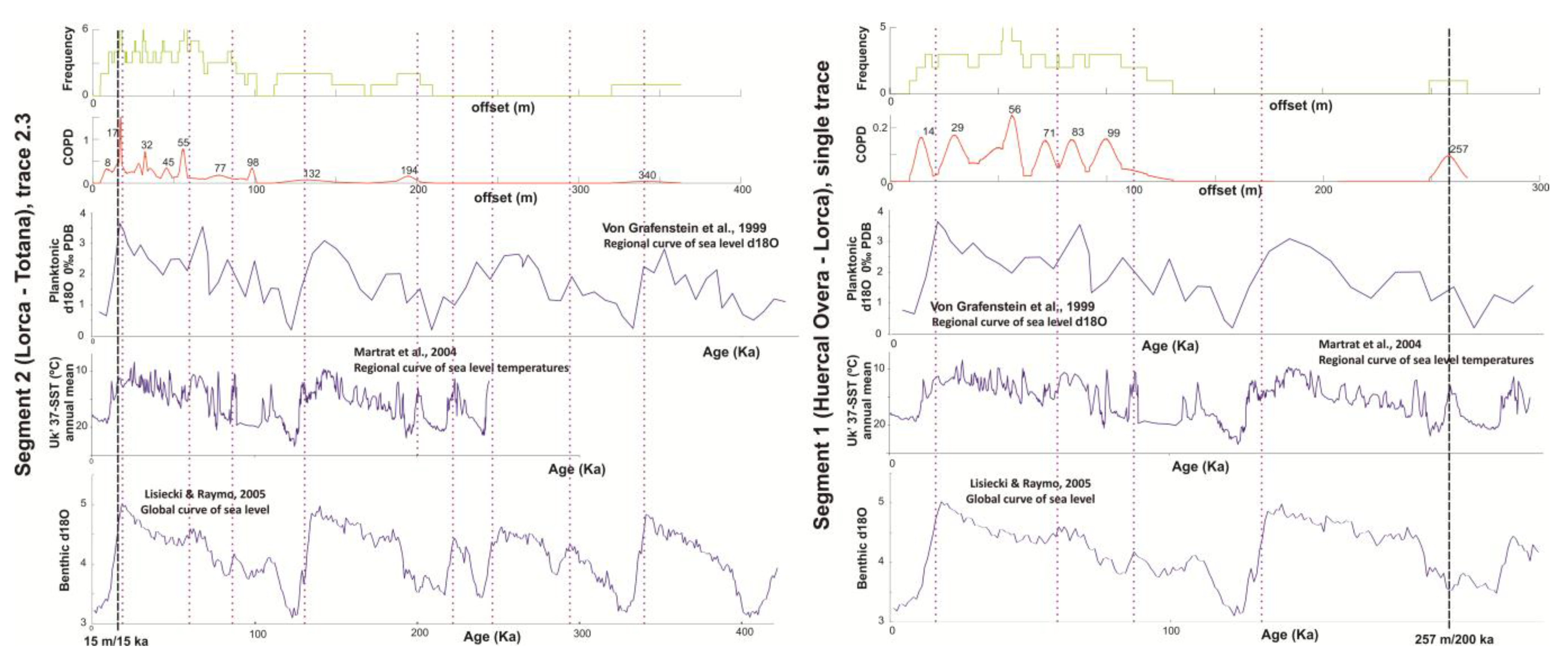 The comparison between climatic and COPD curves is done in Segment 1 (Huercal Overa-Lorca) and in Segment 2.3 (Lorca-Totana) (Figure 15). We employ the global sea level based on a benthic δ18O curve constructed from 57 globally distributed records [44] and regional curves (based on drilling cores in the Alboran Sea) of [45] (benthic δ18O curve) and [46]. This last curve was constructed from planktonic δ18O curve and it represents the mean sea surface temperature. This last curve is a good reference for regional temperatures.