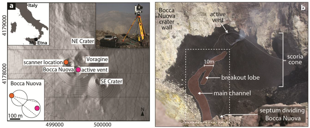 Mount Etna is a ~3330 m-high active stratovolcano in Sicily, Italy, with four continuously-degassing summit craters (Figure 1a) producing lava flows and explosive activity [52], which also occur from eruptions on its flanks. In early July 2012, eruptive activity comprising mild “Strombolian” explosions and gentle lava effusion began in the ~100 m-deep Bocca Nuova summit crater. Activity continued for several weeks, during which a small scoria cone and lava flow field were formed within the crater (Figure 1b). Cloud and volcanic degassing within the Bocca Nuova crater frequently hamper visual observations, but on a number of July days, excellent visibility enabled views of the Strombolian activity (with explosions every ~1–10 seconds) and revealed gentle lava effusion from the active vent that was feeding a small, well-established lava flow up to ~10–20 m wide and 120 m long (main channel, Figure 1b). During the study period, a breakout from the main channel formed a smaller flow lobe (~6 m wide and 25 m long), which was observed flowing down a pre-existing lava channel on the side of the scoria cone (breakout lobe, Figure 1b). The Bocca Nuova activity, as observed from monitoring cameras, continued with a gradually decreasing trend and mainly intermittent explosions from August until December 2012.