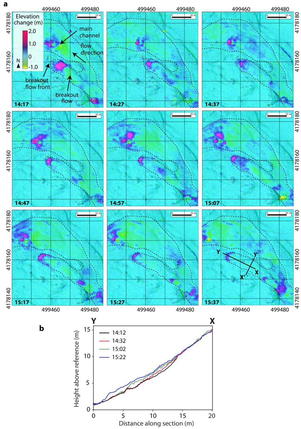 The same DEM difference approach was adopted for quantifying lava emplacement alone from the TLS time series acquired on 21 July. Sequential DEM differences of the flow region clearly show down-flow progression of distinct topographic features in some areas, evidence for flow variability (pulses) and the advance of the breakout lobe flow front (Figure 3).