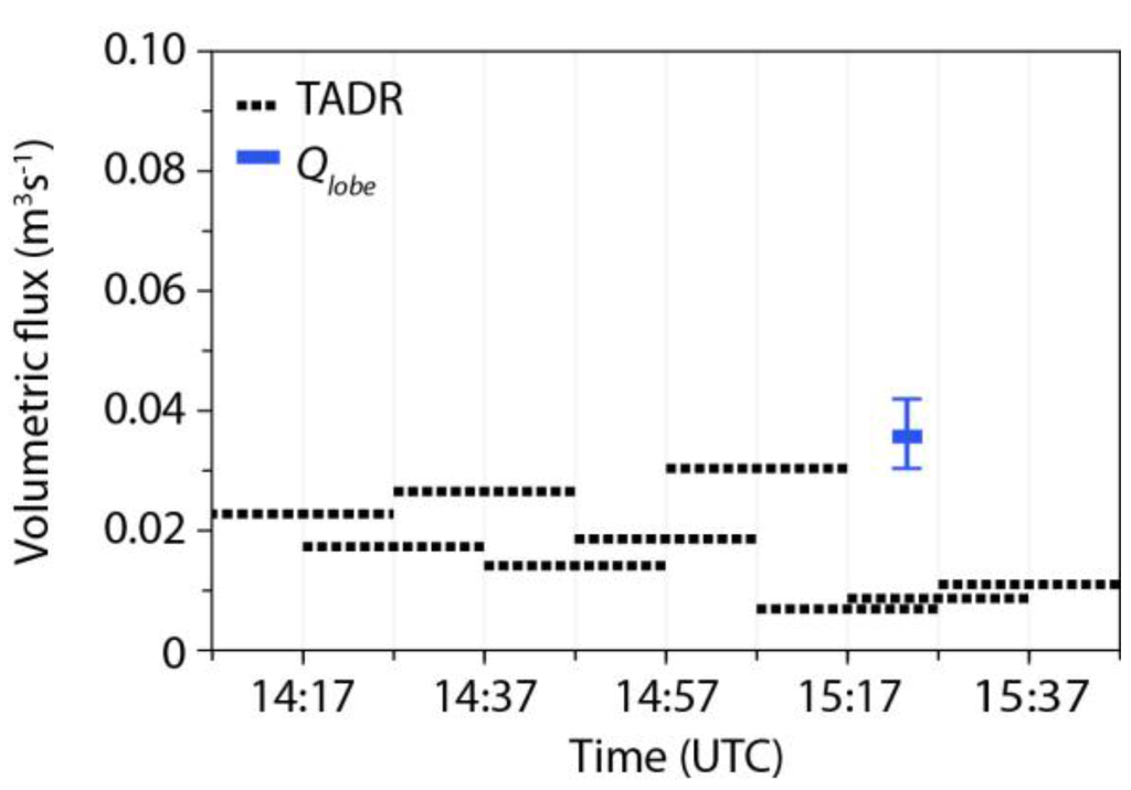 Volumetric flux estimates for the breakout lobe. Time-averaged discharge rate (TADR) values are calculated from the elevation difference maps, with each line bracketing the entire start-to-end duration of the each scan pair used in the calculation. The estimated error in TADR is approximately the line thickness. The local effusion rate for the breakout flow lobe, Qlobe (Section 4.3), is shown with the error bars illustrating the estimated minima and maxima bounds.