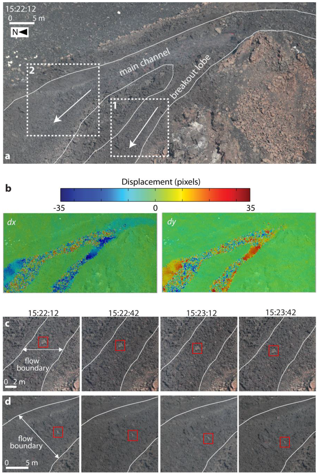 For surface velocity measurements from the time-lapse images, weak image contrast and periods of obscuration by gas and condensing water vapour in the Bocca Nuova substantially limited the number of suitable images. Nevertheless, a set of seven successive images (15:22:12–15:25:12) were identified in which features could be successfully tracked on both the breakout flow lobe and the main channel (Figure 5).