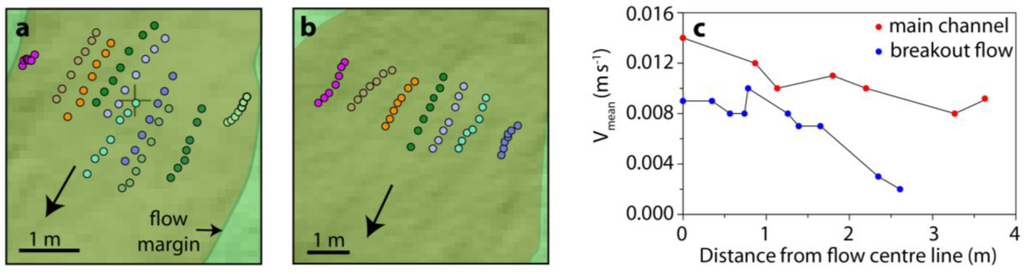 Features were selected across each channel to give across-flow velocity profiles (Figure 6, ten features on the breakout flow and seven on the main channel). To derive flux, channel shape and slope, flow width and thickness are required. For both the main channel and the breakout flow, channel width and slope can be measured directly from the imagery and TLS data. However, depth and channel shape cannot be directly measured for the main flow, because the pre-flow topography was not surveyed. Nevertheless, if a cross-sectional shape is assumed, an indirect estimate of depth can be made if flow rheology is known, and this could be derived from the breakout flow.