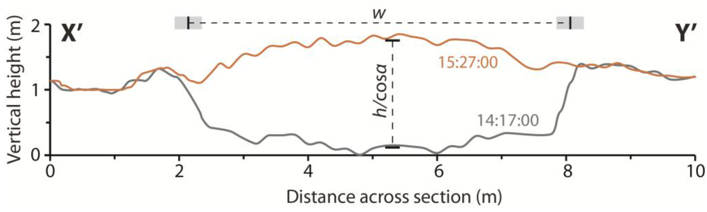 For the breakout flow, cross-sections through the original and the active flow surface show that it was travelling down a pre-existing channel (Figure 7), enabling the flow geometry to be reasonably represented with a rectangular cross-section of thickness, h, and width, w.