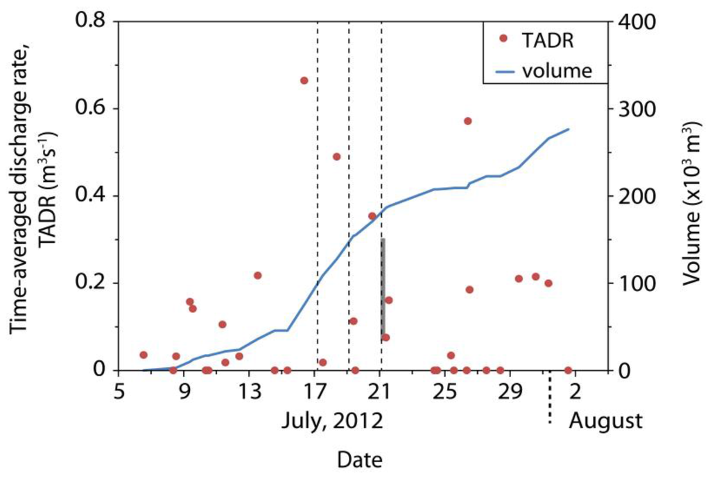 Focusing on the breakout lobe, the entirety of which is captured in the scans, indicates an advance rate of ~0.18 m·min−1 and flow front thickening from ~0.4 m–0.8 m as it advances. Volumetric change gives estimated TADR values from sequential scans, which range between ~0.007 and 0.03 m3·s−1 (Figure 4). The error on these values can be estimated by determining apparent volume changes over an equivalently-sized area (240 m2) of static topography. The root mean square of such volumes was 0.53 m, representing an uncertainty in the TADR values of ~0.0009 m3·s−1. To estimate discharge rates for the main channel, for which the flow front is not covered by the DEMs, a model-based approach relying on measured surface velocities must be used.