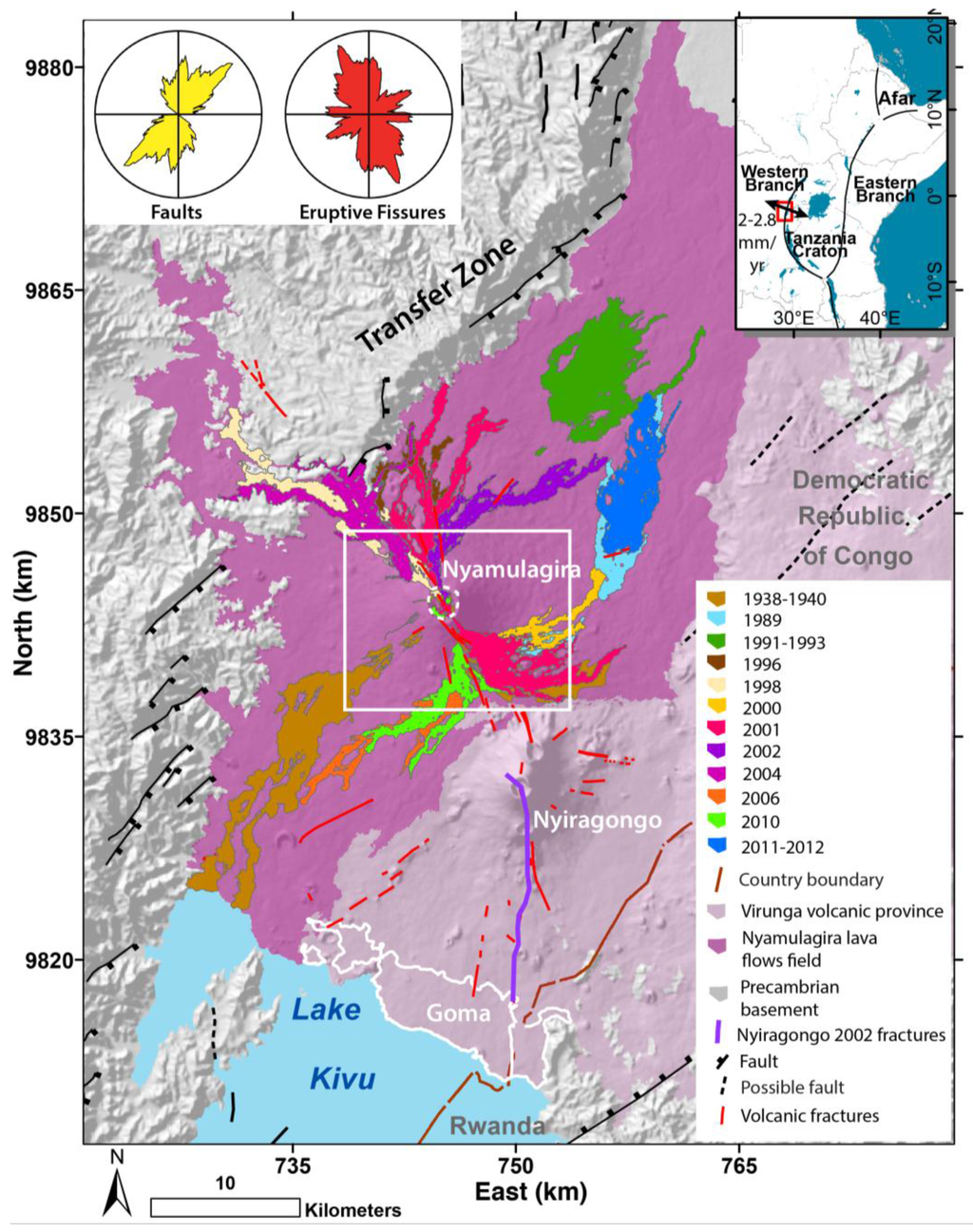 Geological setting of the Virunga Volcanic Province (VVP), western branch of the East African Rift System (EARS), north of Lake Kivu. The rift extension direction in this area is ~N110E, with an estimated extension rate of 2-2.8 mm/year [11,12]. The Goma–Gisenyi urban area is outlined in white on the northern shores of Lake Kivu. Eruptive fissures and lava flows (see the legend) were mapped from radar and optical images [7]. Nyamulagira’s caldera rim is outlined with a white dashed line. Faults are from [13], and rose diagrams of VVP’s faults (yellow) and eruptive fissures (red) are from [9]. The white rectangle gives the extent of Figure 2.