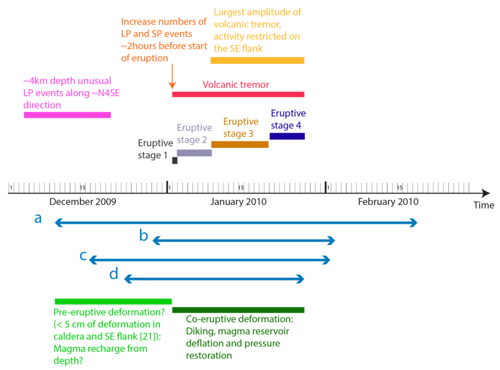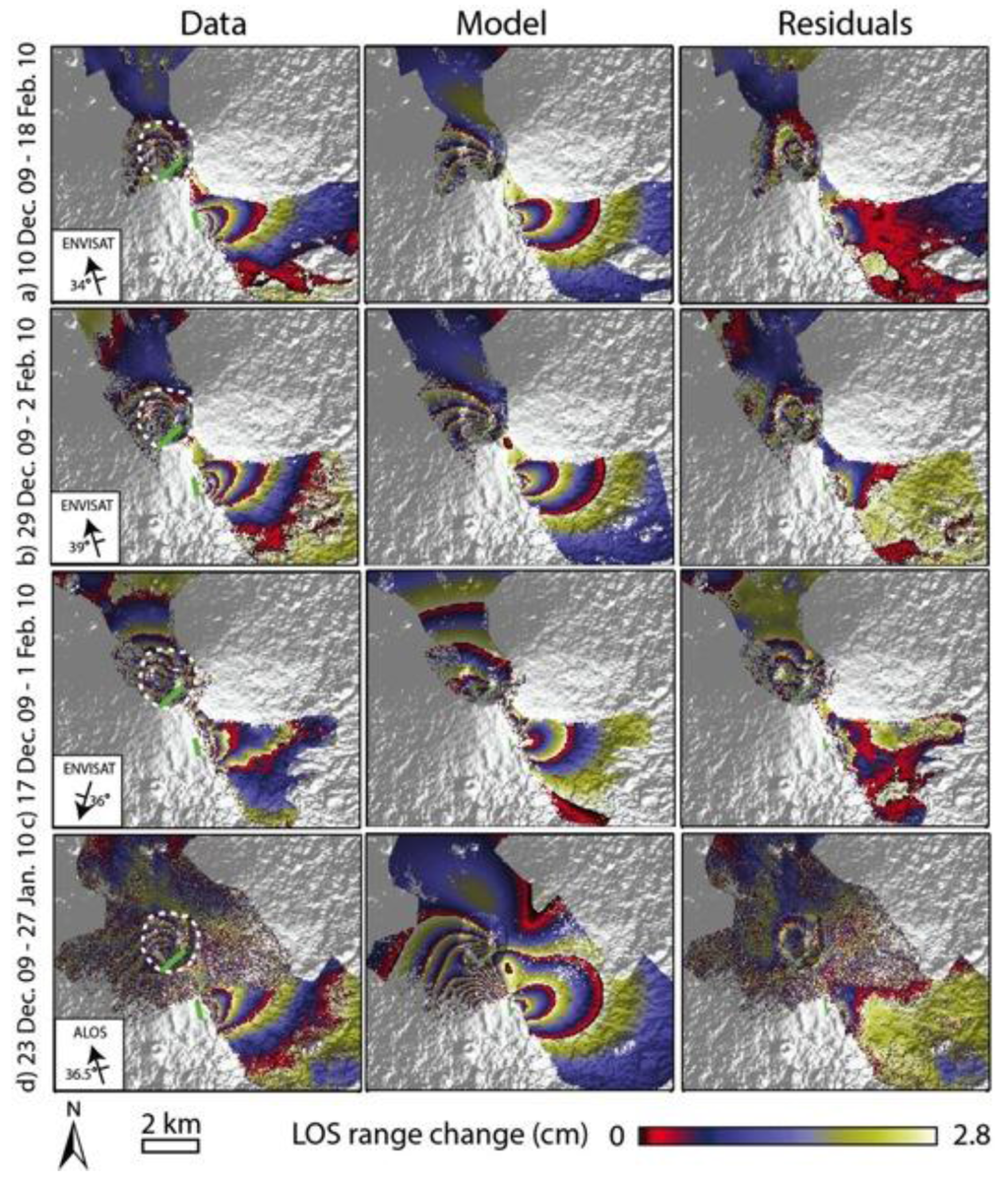 The January 2010 co-eruptive InSAR deformation is the result of successive eruptive processes that occurred between mid-December 2009 and early February 2010. The InSAR data provide a “snapshot”, which includes several potential volcanic processes: a pre-eruptive reservoir inflation, the intrusion of magma in dikes and sills, a co-eruptive reservoir deflation and a post-eruptive pressure restoration from gas exsolution (Figure 5). Unfortunately, the lack of continuous ground-based measurements means that these potential events cannot be observed individually, so their occurrence is a matter of debate and will be discussed in Section 5.