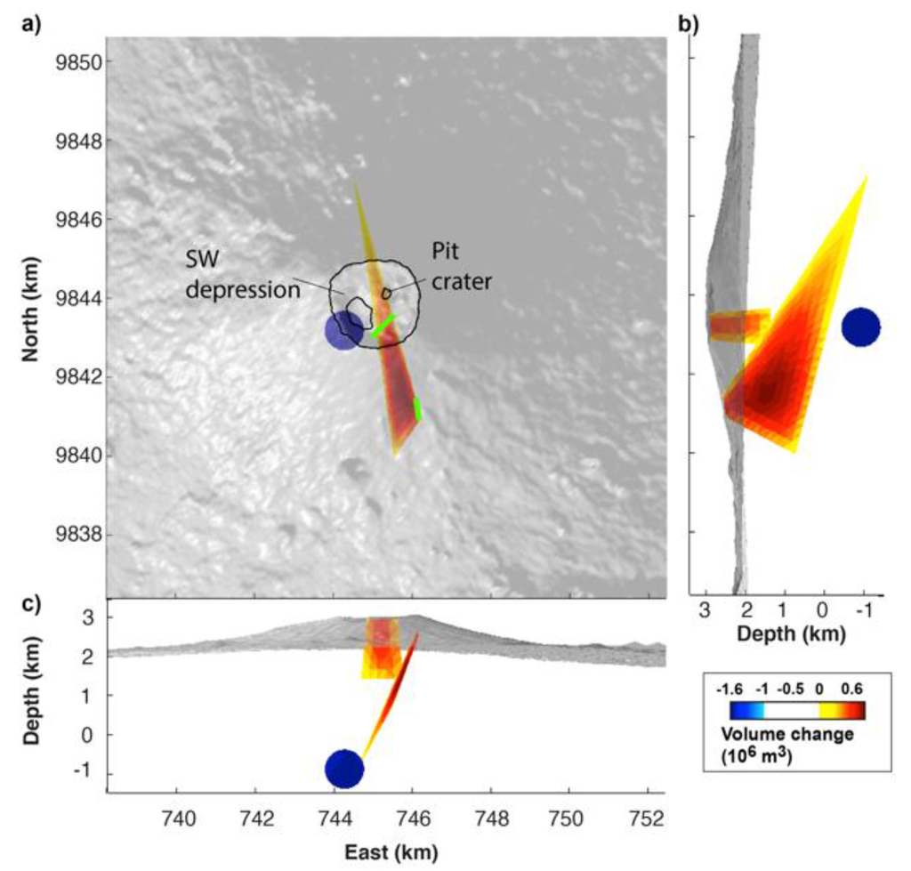 Geometry of the preferred best-fit model including two dikes and a deflating reservoir: (a) Map view. The 2010 eruptive fissures are shown as bold green lines. (b) North-vertical cross-section. (c) East-vertical cross-section. Volume changes of the dike associated with the caldera’s fissure, the southern flank’s fissure and the spherical reservoir are 0.74, 4.2 and −5.1 × 106 m3, respectively.