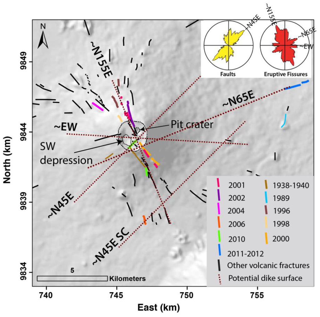 It is a challenge to quantitatively predict the position and direction of dike intrusions and resulting eruptive fissures at volcanoes, because they are governed by the interplay between several factors, such as a heterogeneous regional stress field, preexisting discontinuities and heterogeneous and anisotropic properties of rocks. Nevertheless, dikes at basaltic volcanoes usually show some regularity in their emplacement pattern, as eruptive fissures and vents tend to align with the direction of the maximum regional principal stress [1]. For instance, radial and circumferential diking alternate at the Galapagos volcanoes [2,3,4]; persistent diking occurs along well-developed volcanic rift zones at Kilauea Volcano (e.g., [5]); and summit eruptions alternate with proximal and distal eruptions at Piton de la Fournaise volcano [6].