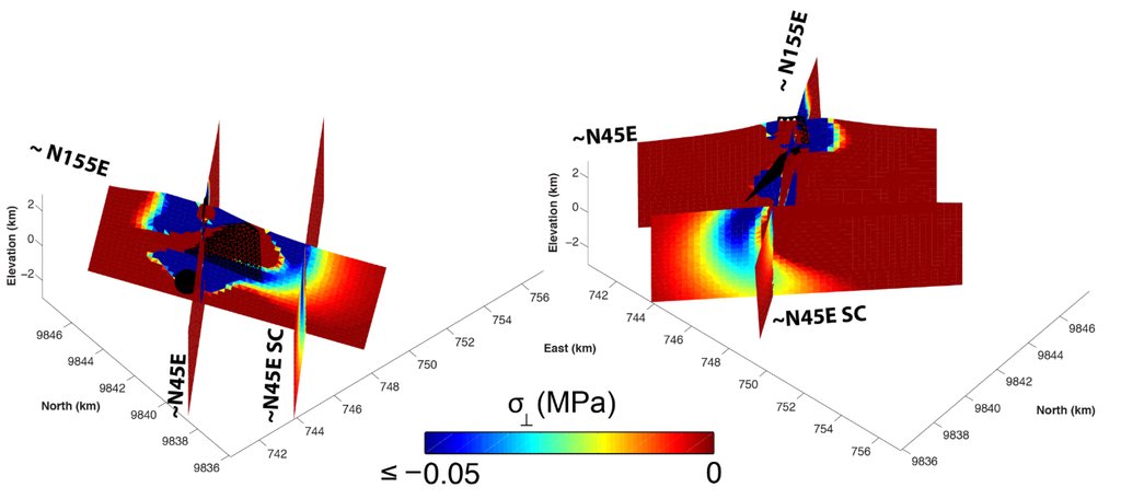 To understand the possible origin of the 2011–2012 eruption, we compute static stress changes induced by the modeled 2010 eruption deformation sources. Static stress changes can be used as an indicator for dike unclamping (e.g., [31,66,67,68,69,70]). Indeed, each dike intrusion changes the normal stress on pathways for potential diking. The sign of the induced normal stress change indicates whether subsequent intrusions are favored or prevented. If the normal stress changes are negative, subsequent dike emplacement is favored (unclamping); otherwise, subsequent dike emplacement is prevented (clamping). Note that we do not intend to forecast the shallow feeder dike orientation for the 2011–2012 eruption, but are interested in understanding the initiation of dikes. To quantitatively estimate the stress changes induced by the 2010 Nyamulagira eruption, we compute normal stress changes on five potential planes induced by the best-fitting deformation sources. From the distribution of eruptive vents, fissures and pre-existing rift-related structures (Figure 1), five potential vertical dike surfaces were considered (Figure 4): an ~N155E direction corresponding to the more active rift zone, an ~N45E direction crossing the summit caldera and an ~N45E south caldera (SC) direction, as well as an ~EW direction and an ~N65E direction connecting to the 2011–2012 eruptive fissure corresponding to a radial dike emplacement. Potential dike surfaces investigated range from the ground surface down to three kilometers below sea level (b.s.l.).