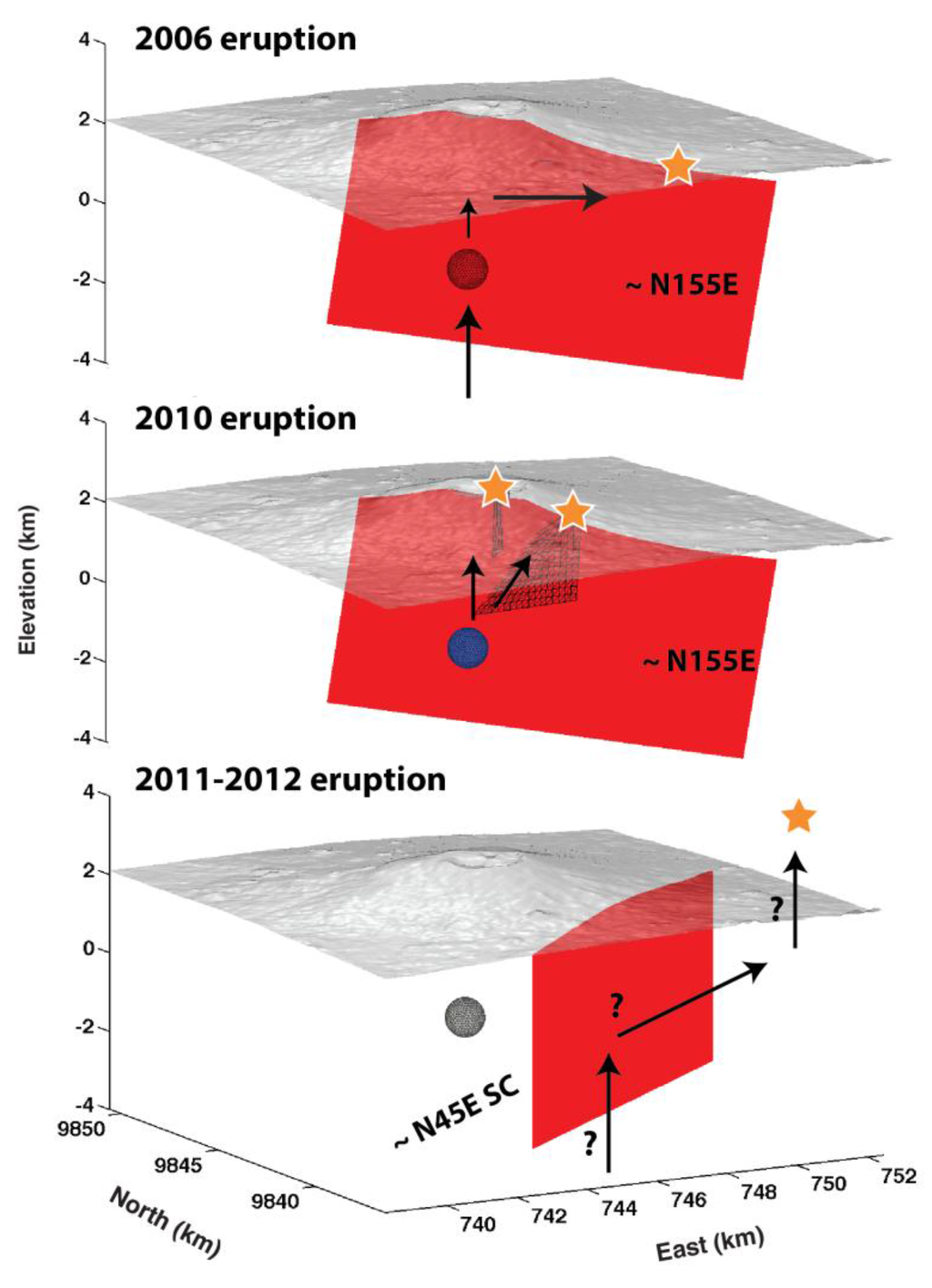 Schematic shallow magma plumbing system for the period 2006–2012. Arrows represent possible magma migration paths. Red and blue sources experience inflation and deflation, respectively. Orange stars denote the locations of eruptive fissures and vents. SC stands for south of the caldera. The two dikes and magma reservoir inferred from the modeling of the 2010 eruption data are represented with black meshes.