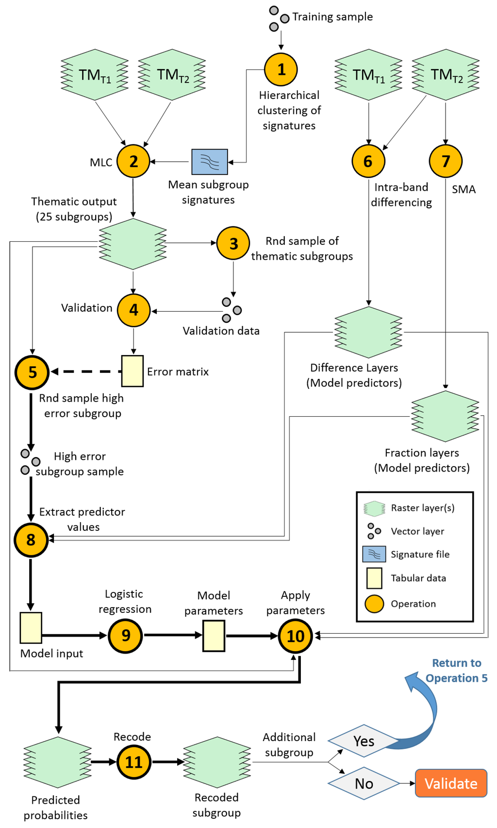 Classification workflow using objects and syntax analogous to the model builder in ERDAS Imagine. Note that reclassification iterations are performed by repeating the loop of Operations 5, 8–11 (in bold), the remaining operations are performed once. The dashed line, directing to Operation 5 in the diagram, represents data not used directly in the operation but rather to establish parameters for Operation 5.