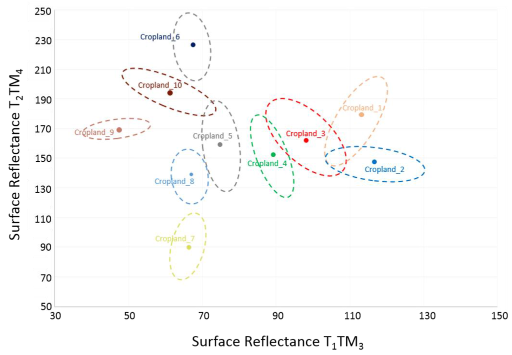 Distribution of cropland clusters in T1TM3 (x-axis) and T2TM4 (y-axis) feature space. Dashed lines delineate the distribution of individual signatures that compose the respective cluster. TM3 is utilized to illustrate soil reflectance variability and TM4 to illustrate the variability in vegetation response. Surface reflectance is scaled to unsigned 8-bit.