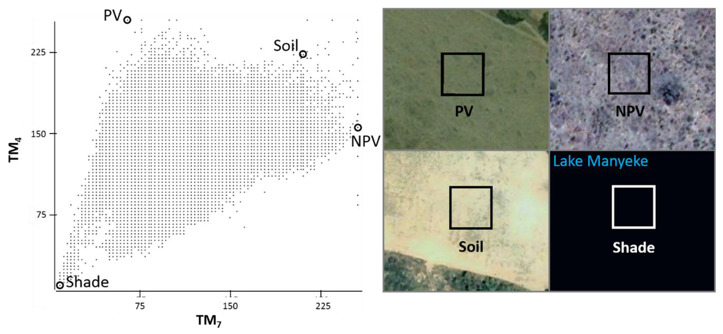 Predictors for the logit model were generated from the original multi-spectral data, incorporating elements of phenology and sub-pixel composition of land cover. Multi-temporal data is utilized to capture variability in phenology which has been demonstrated to enhance differentiation between cropland and surrounding natural land cover [59,64,65,66] as well as among crop type [67,68]. Temporal intra-band differencing (e.g., B1Ti–B1T2) was adopted to measure change in phenological states within the unique spectral windows of each band, between date 1 (T1) and date 2 (T2) (Operation 6, Figure 2). Quantitative subpixel information of surface components was estimated using SMA to spectrally unmix one image of the seasonal image pairs (Operation 7, Figure 2). We selected the Landsat image acquired during the harvest season since spectral separation between cropland and the surrounding natural savanna was slightly greater than that found in the preseason scene. No discernible advantage in separation between cropland and settlement was detected between scenes. A Sequential Maximum Angle Convex Cone (SMACC) [69], utilizing a residual minimization model, was used to identify a pseudo set of image endmembers that were displayed in a scatterplot amongst all pixels in the TM image as reference locations that would guide endmember selection. The set of four endmembers used in this analysis was selected through iterative testing of candidate pixels at reference locations, representing photosynthetic vegetation (PV), soil, non-photosynthetic vegetation (NPV), and shade components (Figure 4). Results of the constrained model showed few pixels with values below 0 or above 1 and a mean RMS error of 5.538 indicating that the selected endmembers effectively characterized the landscape. An inspection of RMS distribution revealed the highest error pixels concentrated in areas that seasonally inundate with water, however the magnitude of error was not considered serious enough to warrant modification of the model. The library of candidate predictors utilized in the logit model consisted of six difference variables (one for each band pair, 1–5, and 7) and four fraction images. Predictor values were extracted at the sampled locations and collated (Operation 8, Figure 2).