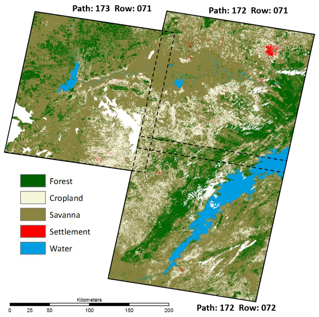 Landsat 5 Thematic Mapper (TM) data was collected for three footprints that covered nine of eleven administrative districts, either wholly or in large part. The footprints were located at nominal scene centers of Path: 172, Row: 071; Path: 172, Row: 072; and Path: 173, Row: 071. Given the breadth of study area and characteristic smallholder farming, the Landsat 5 TM instrument offered the optimal pixel resolution of 30 m [55]. Two images were selected for each satellite footprint with acquisition dates corresponding to the pre-season of 2008 and the harvest season of 2009 (Table A1). The choice of 2008/2009 imagery coincided with survey data collected during 2007–2008. Optimally, scenes from the growing season would also be utilized but persistent heavy cloud cover combined with the 16-day reacquisition interval did not yield an image of sufficient quality. Quantized calibrated pixel values were converted to at-sensor radiance based on the minimum and maximum spectral radiance for each band [56]. Radiance values were subsequently converted to surface reflectance using an image-based procedure of dark-object subtraction [57,58]. Fmask software (https://code.google.com/p/fmask/) was utilized to identify cloud/heavy haze and cloud shadow in each TM scene. Cloud masks were combined into a cumulative mask and applied to both images. Multi-temporal composites were then generated for each footprint by stacking the six multi-spectral bands (TM 1–5, and 7) of the seasonal image pairs to generate a 12-layer image.