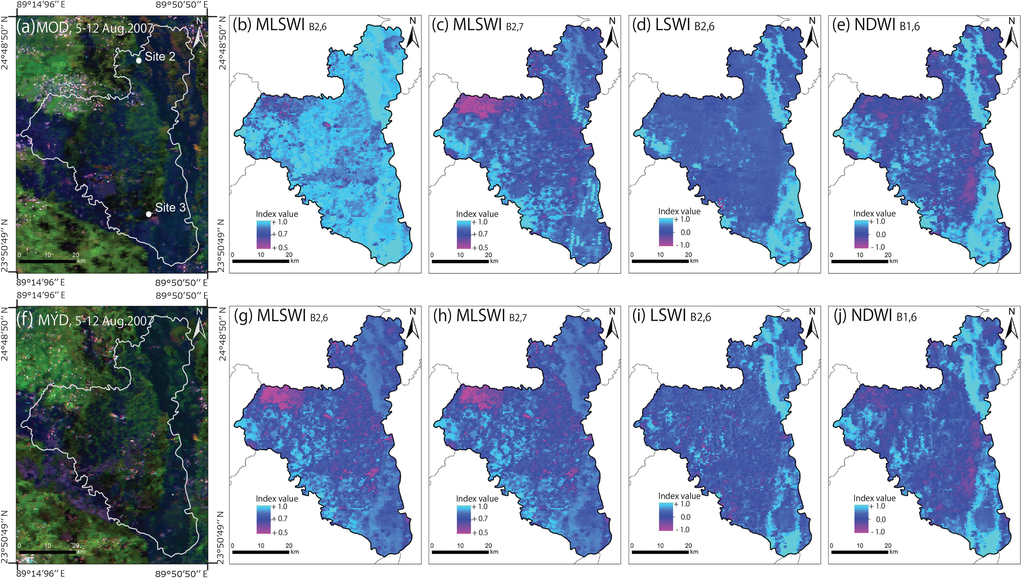 Three spectral indices, NDWI, LSWI, and MLSWI, were designed to be correlated to surface wetness, focusing on the sensitivity of water indices to floodwater detection over the whole of Bangladesh, where monsoon river floods are dominant and frequent, causing the maximum inundation extent. Figure 3 shows the different water indices: MLSWI 2 and 6 (Figure 3b,g), MLSWI 2 and 7 (Figure 3c,h), LSWI (Figure 3d,i), and NDWI (Figure 3e,j), all of which use data from MOD09A1 (Terra) acquired in the morning and MYD09A1 (Aqua) acquired in the afternoon.