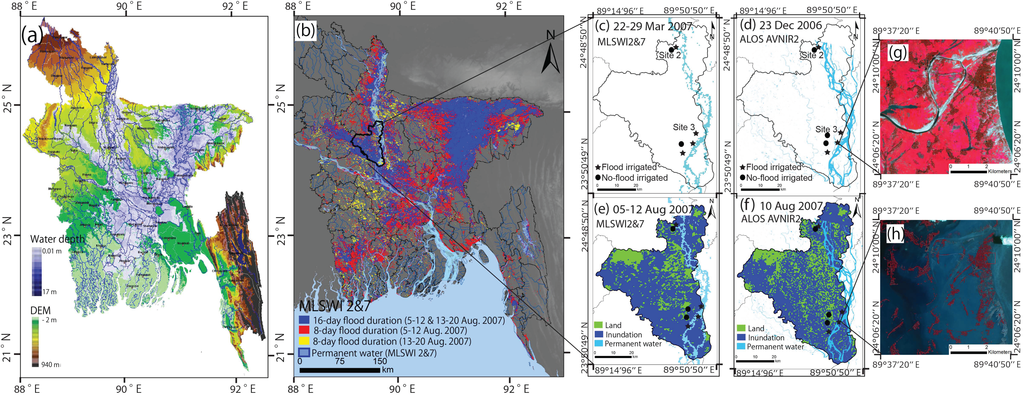(a) Simulated inundation map on 18 September 2013 from BWDB FFWC; (b) maximum extent inundation map from a combination of Terra and Aqua MODIS images during 16 days (5–20 August 2007), and a comparison of MLSWI with ALOS AVNIR-2, the permanent water (cyan pixels) of the Brahmaputra River from (c) MLSWI and (d) NDVI threshold classification of ALOS AVNIR-2 in the Sirajganj district, respectively. Sites represent inundation extent of (c,d) pre- and (e,f) flood-time conditions (floodwater is blue pixels). Site three is enlarged to show the (g) pre- and (h) flood-time conditions using AVNIR-2 composite RGB images (R: band 4 = 760–890 nm, G: band 2 = 520–600 nm, B: band 1 = 420–500 nm).