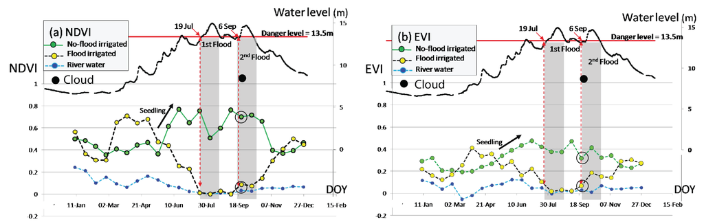 Flood damage assessment is an essential part of flood risk assessment for decision-making processes and potential risk reduction in flood-prone river basins []. In contrast to hazard mapping, however, the assessment of damage and risk mapping is still far from being common practice [,]. Risk and damage information can be mapped with representative parameters with regard to flood risk: affected people, potential economic loss, i.e., building damage and crop damage. In order to estimate crop damage, damaged crop fields should be identified and classified automatically and accurately, incorporating crop phenology information. To this end, multi-spectral remote sensing-based indices have been developed and used to monitor vegetation structures and functions, including crop classification. To estimate crop biophysical parameters (CBP), such as the leaf area index (LAI), vegetation cover, and gross primary production, vegetation indices (VI) were utilized in empirical measurements of vegetation activity on the land surface, such as the normalized difference vegetation index (NDVI) and the enhanced vegetation index (EVI) [,,,]. Huete et al. introduced the enhanced vegetation index (EVI), which has an improved sensitivity to moderate-to-high vegetation biomass. MODIS-derived EVI is also widely used and designed to minimize the effects of the atmosphere and canopy background that contaminate NDVI and to enhance the green vegetation signal [,,,].