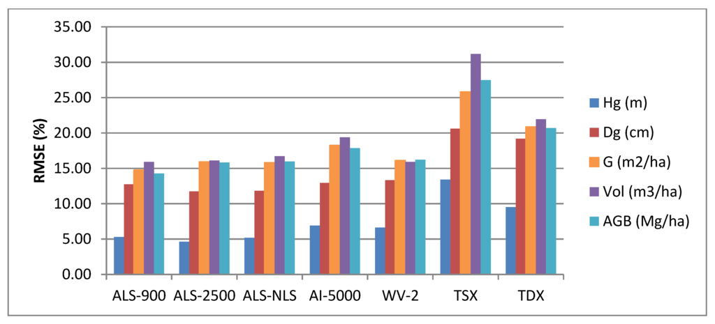Regardless of these limitations, 3D techniques still provide superior capabilities for accurately measuring vegetation structure compared to 2D data, especially radar data that have been somewhat deficient, as the amplitude of the radar signal tends to saturate at certain level of biomass, and higher biomasses cannot be measured accurately [43,44]. In this study, there are no apparent sign of saturation in predicting high biomass as it normally occurred with optical and radar images. This indicates that radar image-based point cloud has great potentials in large area mapping and in the monitoring of changes in the forest structure because of its more frequent coverage and its ability to acquire images through clouds compared to optical remote sensing techniques. Even though ALS and aerial image stereo-photogrammetry provide estimates that more accurate for forest attributes compared to 3D space-borne techniques, it is anticipated that very high resolution satellite image photogrammetry will play an important role in forest mapping and monitoring at lager scale given the accuracy level achieved by WV-2. We see that all RS data have a good synergy and complement to each other.