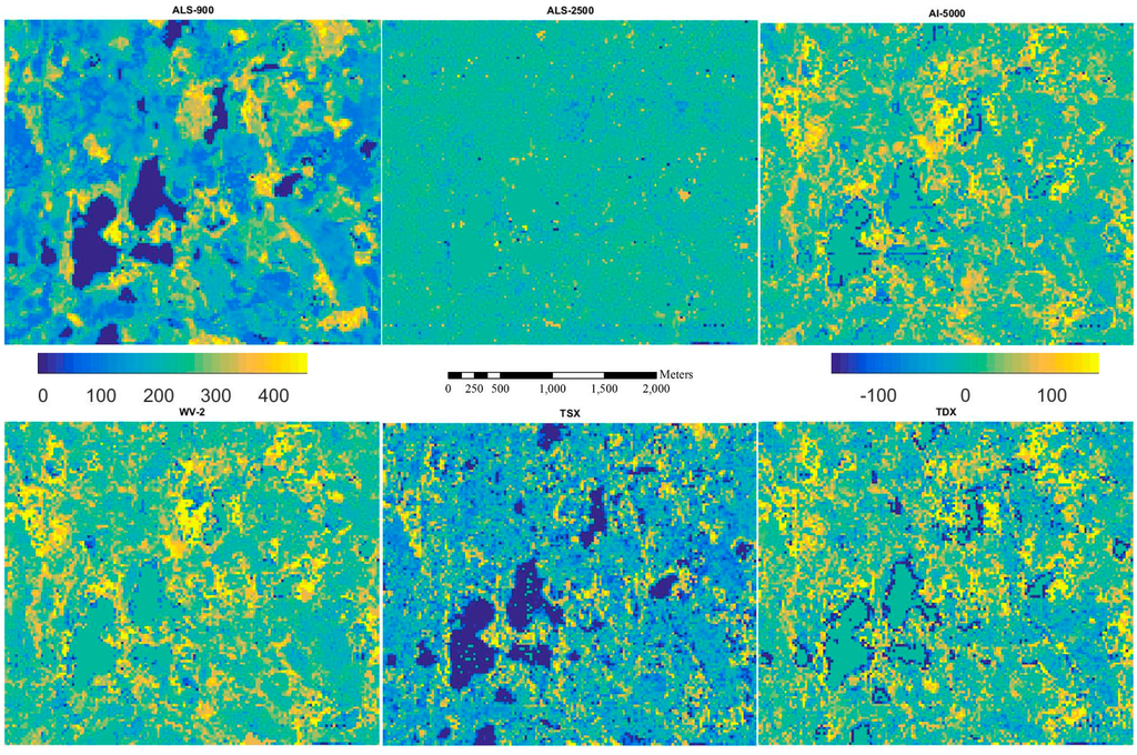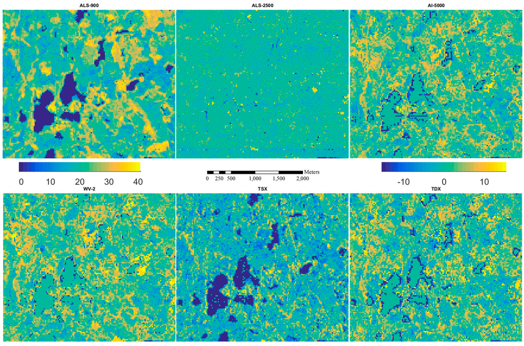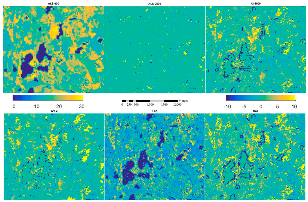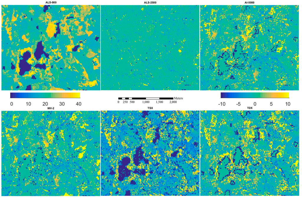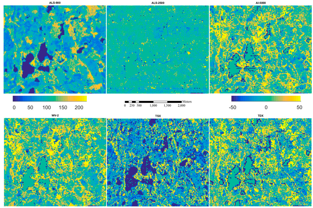 Figure 5, Figure 6, Figure 7, Figure 8 and Figure 9 show the inventory map from ALS-900 data and the difference maps between using ALS-900 and other point clouds except ALS-NLS data, because it is quite similar to the one using ALS-2500 data. From these figures, it can be seen that similar results were obtained for most parts of the area. However, in some particular forested areas, estimates differed considerably. When further investigations were performed on these forested areas, it was found that the image matching was problematic. For example, in a single story sparsely forested area, image matching was not accurate with AI-5000 and WV-2 images probably because it is difficult to correctly detect the matching points between images due to the high degree of variations in height. The problem in matching is that wrong height was given by AI-5000, whereas image matching was normally failed, i.e., no point was produced with WV-2 data. This is maybe one reason why WV-2 data performed better than AI-5000 data. It should be pointed out that TSX data has the tendency to overestimate the attributes of low biomass forests. There were also considerable amount of points created from TSX data over water area so the lakes are more visible on the difference maps between ALS-900 and TSX data.