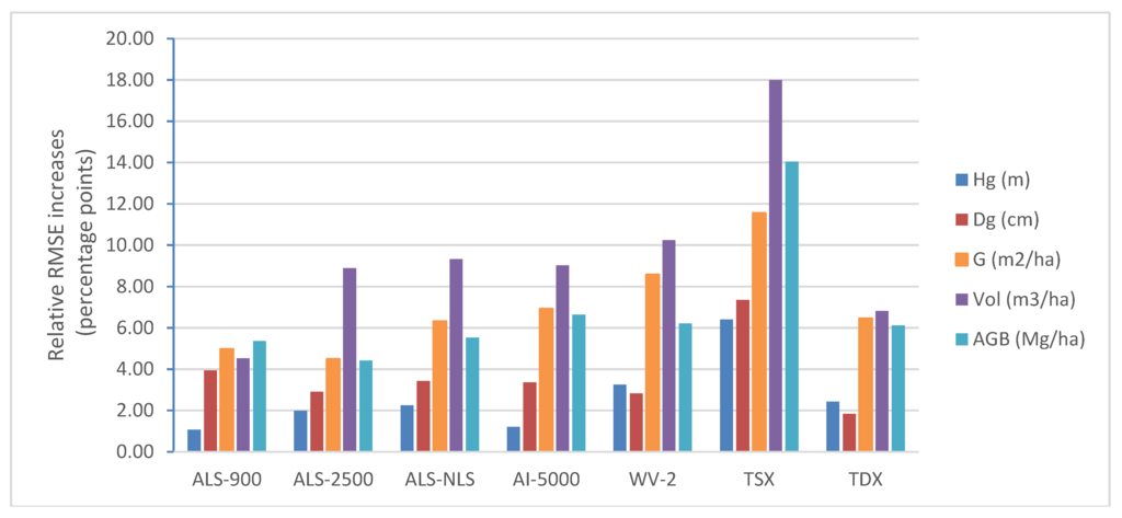 When plot size reduced from 32 m × 32 m to 16 m × 16 m, relative RMSEs increased by 1 to 5.4 percentage points with ALS-900 data, by 2.0 to 8.9 percentage points with ALS-2500 data, by 2.3 to 9.3 percentage points with ALS-NLS data, by 1.2 to 9.0 percentage point with AI-5000 data, by 2.8 to 10.2 percentage points with WV-2 data, by 6.4 to 18 percentage points with TSX data and by 2.4 to 6.8 percentage points with TDX data. There are no big differences in the increases of relative RMSE among difference datasets except TSX and ALS-900. With TSX data, the increases in relative RMSE were almost doubled while smaller increases in relative RMSE were obtained with ALS-900 compared to other image-based data. Increases in estimation errors were larger for G, VOL and AGB estimators than for Hg and Dg (Figure 10).