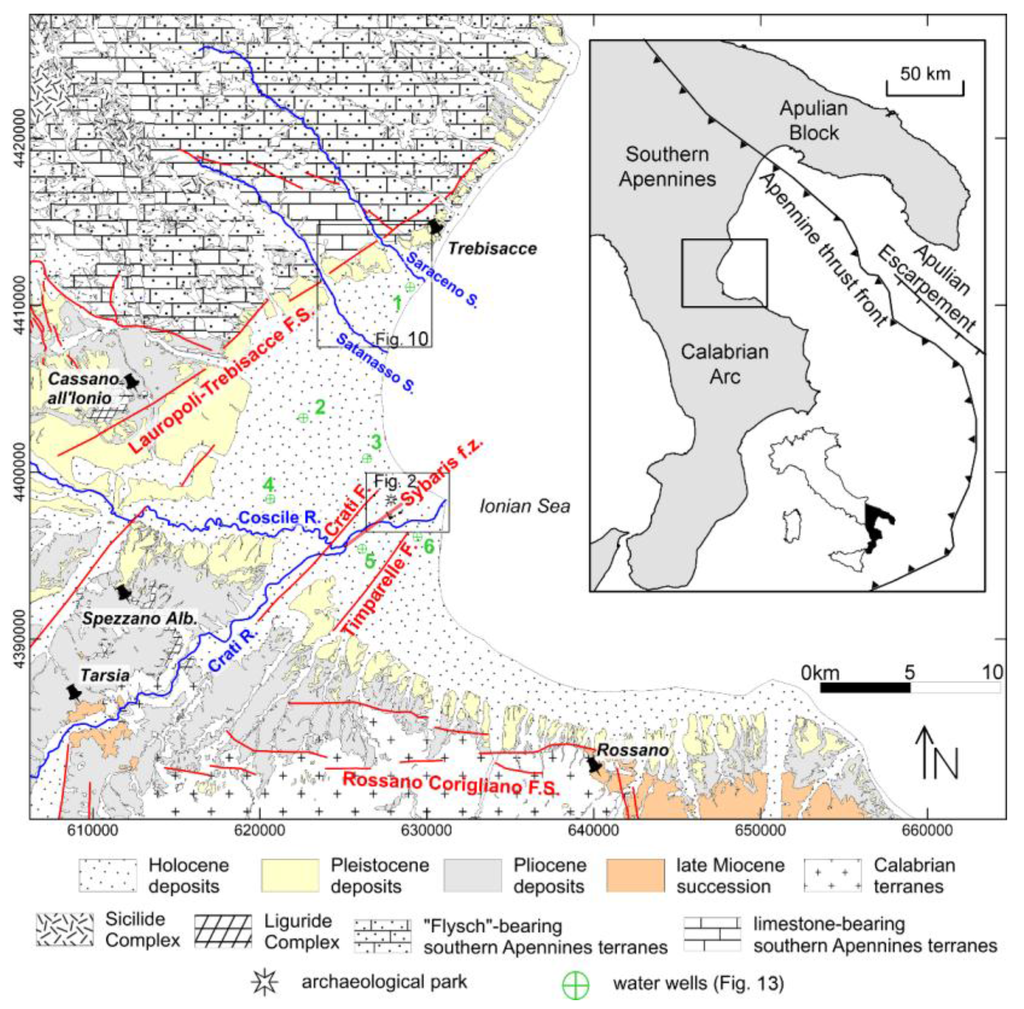 - Cucci, L. Geology versus myth: The Holocene evolution of the Sybaris Plain. Ann. Geophys. 2005, 48, 1017–1033. [Google Scholar]