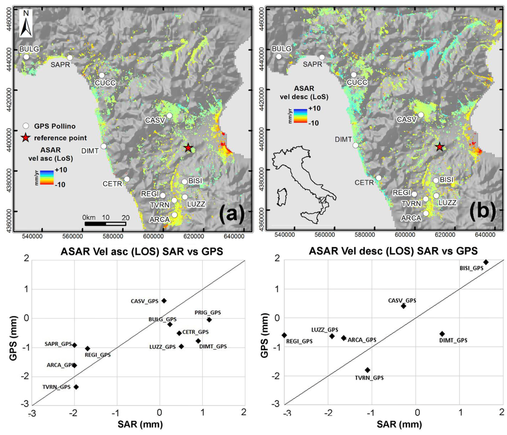 Initially, we validated our results comparing the ascending and descending velocity map after shifting the former with respect to the reference point of the latter preventing the subsidence areas. We also validated the Envisat results comparing with the available GPS in the whole SAR frames (Figure 3). Firstly, we projected the GPS velocities onto the ascending and descending SAR LOS respectively then we averaged the InSAR velocities in correspondence of the GPS benchmarks considering a buffer area of 200 meters. The comparison between GPS and InSAR velocities is shown in Figure 3a,b for the ascending and descending tracks. Except for very few GPS benchmarks, the velocities differences are within 1.5 mm/yr, which is the associated error to the multi-temporal SAR outputs. Unfortunately, it has not been possible to perform the same validation method for the CSK results because not enough CGPS are available. However, considering the common similar patterns and trends for both Envisat and CSK ascending and descending retrieved maps, we convinced the good quality of the obtained CSK results. Note that for the CSK processing we focused our study on the Sibari Plain.