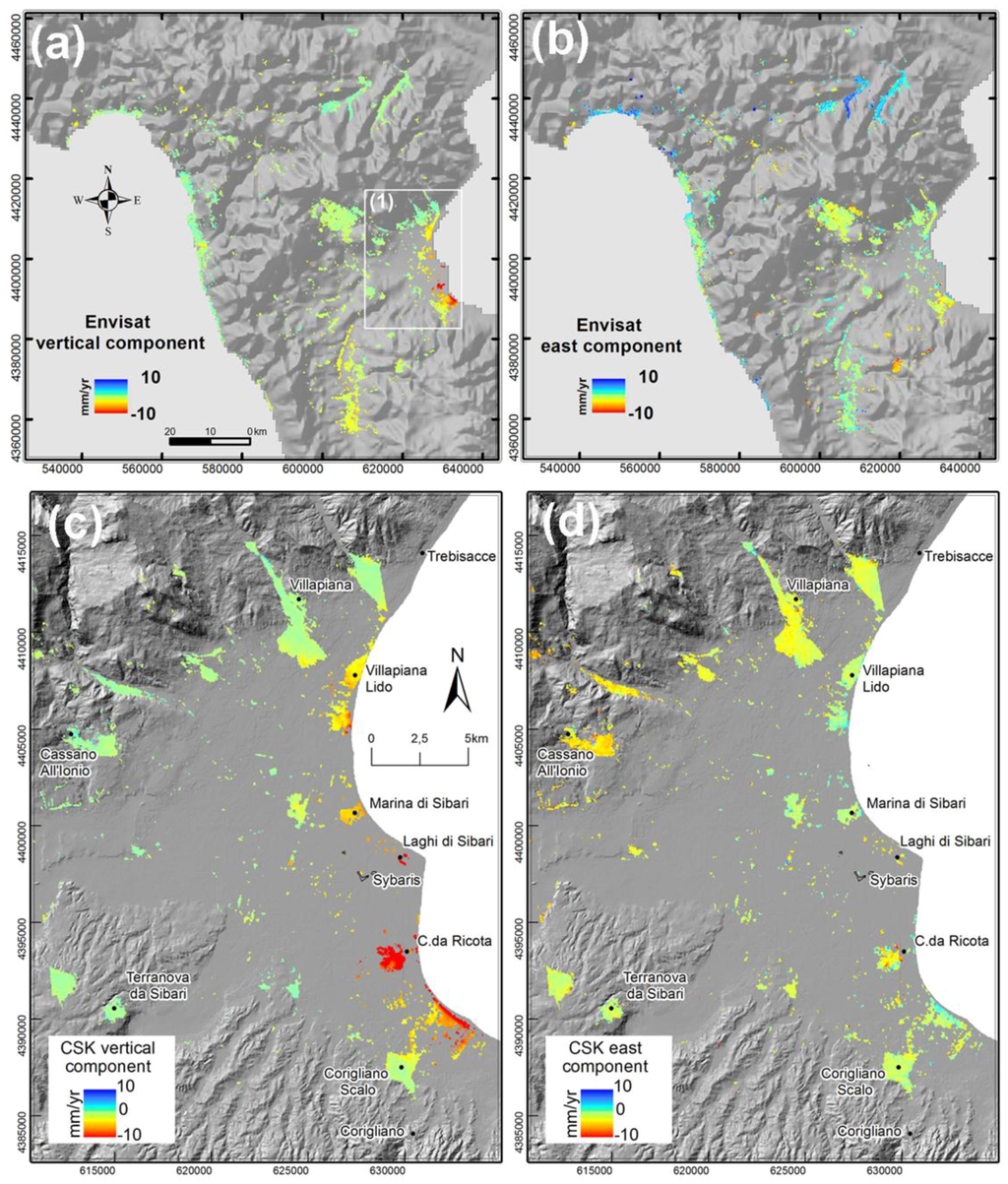 The distribution of Vertical component shows a coastal area (from Villapiana Lido to Marina di Schiavonea) characterized by subsidence with velocity up to ~−20 mm/yr (Envisat and COSMO-SkyMed sensors); on the contrary, boundary areas of SP show ~0 mm/yr on the vertical velocity component (Figure 4).