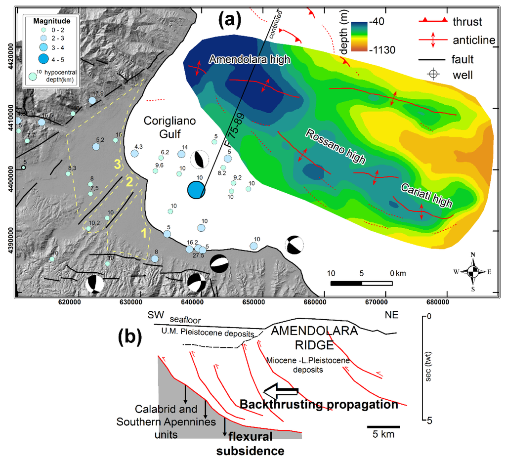 The SP is located at the junction of the Calabrian Arc and the Southern Apennine. Moving few kilometers towards SE from the SP, the geodynamic setting is complicated by the presence of the junction (Apulia Escarpment) (Figure 1) between the thin Ionian basin crust (southward) and the thick crust of the Apulian platform (northward). In the Ionian Sea, in front of the SP an active oblique-contractional belt (the Amendolara Ridge) is recognized. The latter is due to the combined effects of subduction retreat of the Ionian slab underneath Calabria and stalling of Adriatic slab retreat underneath the Apennines [71]. The belt consists of the alignment of three anticlines (Amendolara, Rossano and Cariati) bounded by a main SW-verging back-thrust (Figure 5a).