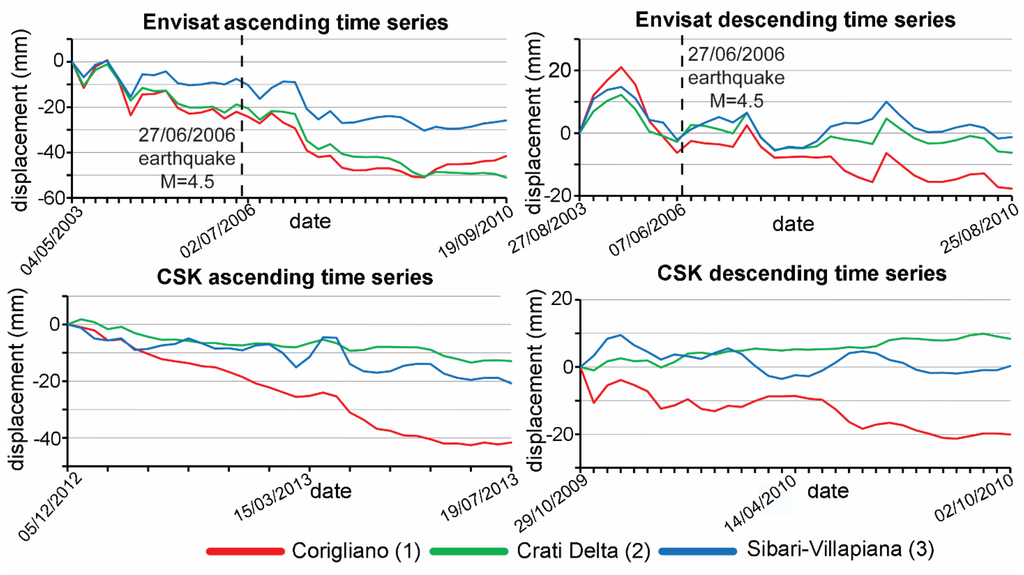 In detail, the ascending time series reveal a general trend characterized by an increase of the negative displacements but with greater absolute values in the southern sector. The descending time series highlight an increase of negative displacements in the Corigliano sector with values between 10 mm and −5 mm in the Villapiana-Sibari sector, and an expected increasing positive trend in the Crati Delta sector. This trend can be related to the presence of a horst bounded by Crati and Timparelle faults [48].
