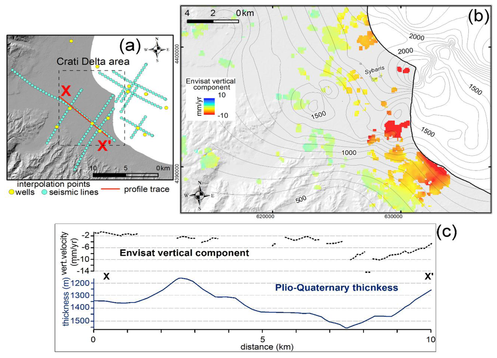 We compared ground velocity profiles, for the Envisat Vertical component, with the corresponding profiles of the Plio-Quaternary deposits thickness. The comparison (Figure 7c) shows a good correlation between the general subsidence trend and the Plio-Quaternary succession thickness. We observed higher subsidence values in the E and NE sectors of Crati Delta, where the Plio-Quaternary succession is thicker. In the SW sector, the reduced thickness corresponds with lower subsidence values. Lower values are also detected in the S-SE sector (Corigliano harbor area), where the presence of shallow igneous-metamorphic bedrock drives the Plio-Quaternary succession thickness.