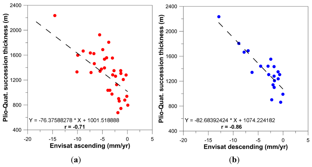 Correlation between (a) ascending and (b) descending velocities with the thickness of the Plio-Quaternary succession.