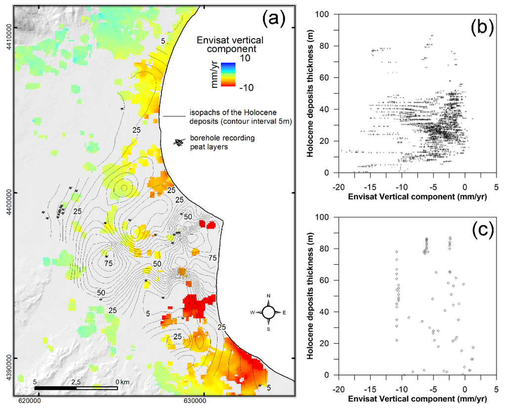 We analyzed 200 boreholes (Demanio Idrico Prov. Cosenza, [82,83]) and literature data [57,61,65] to define lithology, vertical-lateral variations and thickness of the post-LGM deposits. An isopach map of the Holocene succession superimposed with the Envisat Vertical component was generated (Figure 9a). The greater vertical displacement values are located in the area of the Holocene deposits accumulation but the larger subsidence rates do not correspond to the major depozones.