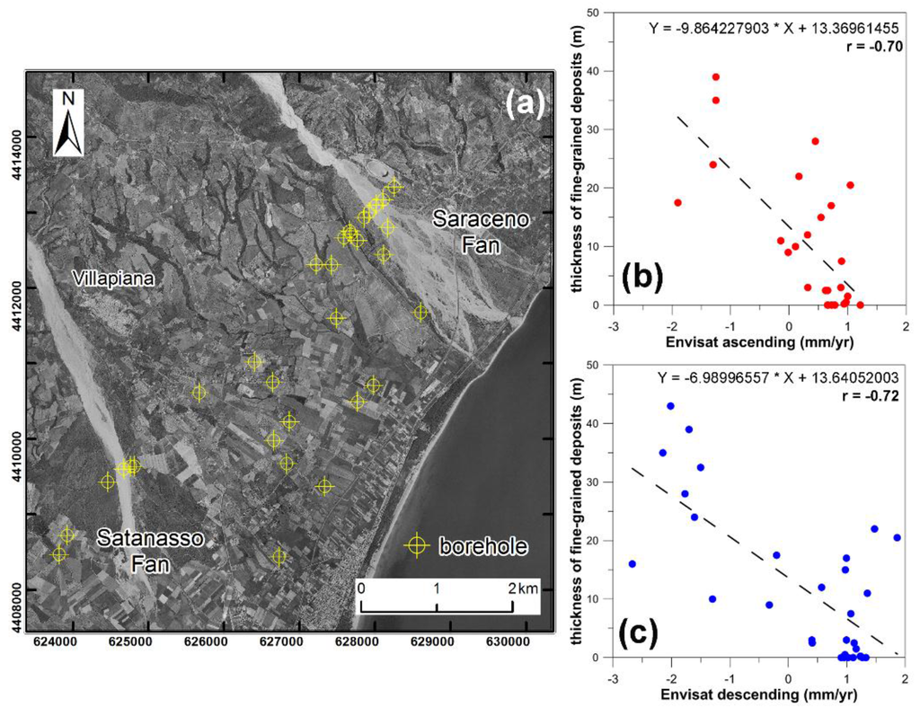 Although the minor role of Holocene deposits compaction, the boreholes analysis highlights a clear influence of the lateral variations of the sediments lithology for the subsidence phenomena. In detail, we took into account the ground deformation patterns from ascending and descending Envisat data, and the boreholes into the Saraceno and Satanasso alluvial fans areas (Figure 10a), considering the thickness of fine-grained (silt and clay) deposits (Figure 10b,c). Greater ground velocities are usually retrieved close to the boreholes recording a major thickness of fine-grained sediments while the lower values are in correspondence of the coarse-grained (gravel and sand) deposits which made up the alluvial fan bodies. Thus, the lateral variation of the fine-grained materials thickness creates differential land subsidence.