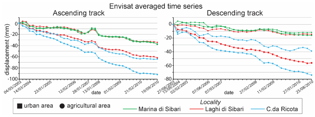 In Laghi di Sibari and C.da Ricota sites, we observe a progressive temporal differentiation in the subsidence values that increase faster in urban areas reaching a maximum difference compared with agricultural ones of ~35 mm in August 2010 (for the descending track) and of ~25 mm in September 2010 (for the ascending one). The subsidence values are very similar for the two considered sectors in the Marina di Sibari zone, where the descending time series show a little increase (~5 mm) of ground deformation values into the urban area.