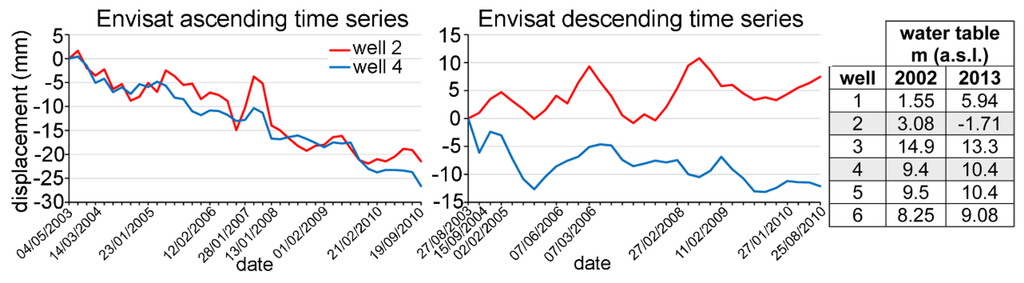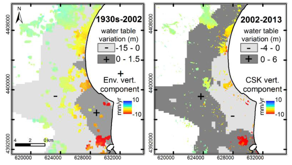 Subsidence rates of 3–5 mm/yr induced by to the Holocene deposits consolidation due to phreatic and confined water tables drop are calculated by [66] and are not sufficient to justify the vertical displacements inferred by SAR data.